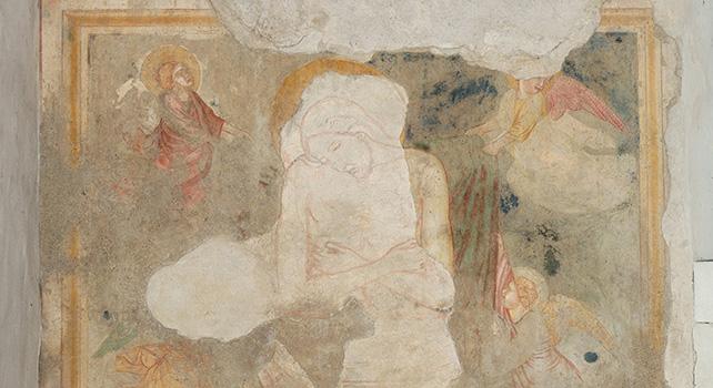 Il dipinto è stato ritrovato nel 2005 nel corso di periodici lavori di manutenzione. È probabile che la decisione di coprire l’immagine con bianco di calce fosse presa in seguito ai danni dovuti a infiltrazioni d’acqua dal tetto e dalle pareti, che provocarono un esteso fenomeno di carbonatazione con la conseguente decoesione della pellicola pittorica e la parziale caduta dell’intonachino.