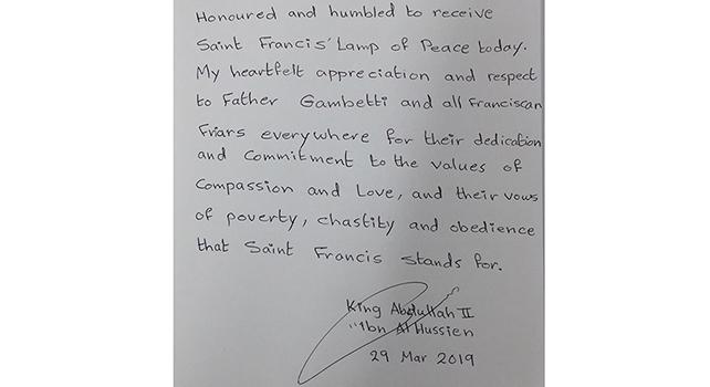 Assisi, il messaggio del re di Giordania Abdullah II sul libro delle presenze