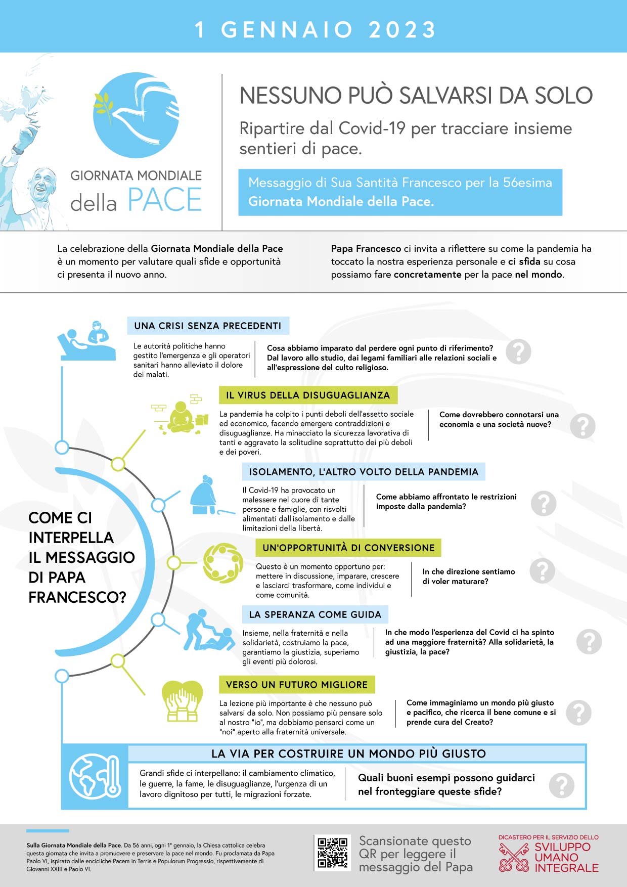 Nessuno può salvarsi da solo. Con il messaggio per la GMP 2023 Papa Francesco vuole farci ritornare ai momenti spaventosi, duri e dolorosi degli inizi della pandemia da Covid-19, e ci chiede di riflettere coraggiosamente su che cosa abbiamo imparato e su quali occasioni non abbiamo saputo cogliere. Da una crisi non si può uscire uguali, ci aveva detto il Papa sin dall’inizio: o se ne esce migliori o peggiori. Questo è il momento per chiederci, come singoli e come comunità: tre anni dopo siamo migliori o peggiori?