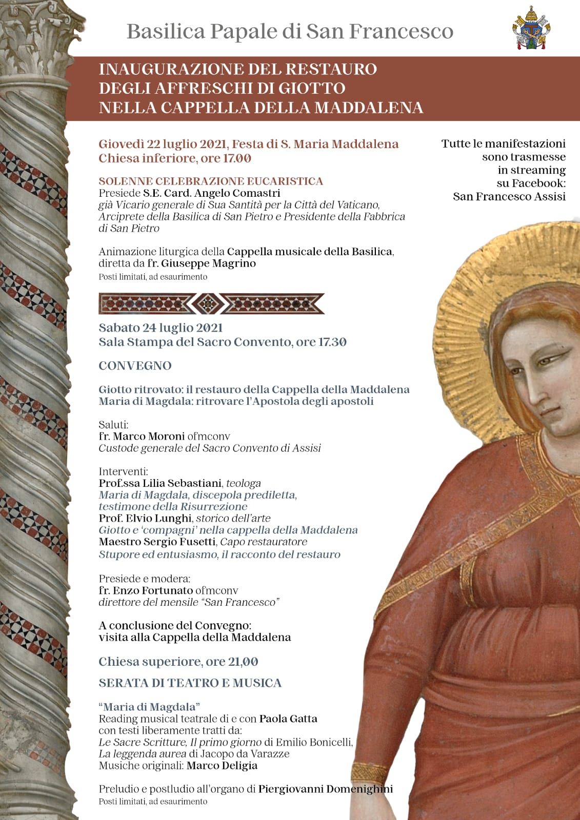 Sabato 24 luglio 2021 nella sala stampa del Sacro Convento, ore 17.30 il convegno "Giotto ritrovato: il restauro della Cappella della Maddalena Maria di Magdala: ritrovare l’Apostola degli apostoli". Dopo i saluti del Custode generale del Sacro Convento di Assisi, fr. Marco Moroni ofmconv, gli interventi della Prof.ssa Lilia Sebastiani, teologa (Maria di Magdala, discepola prediletta, testimone della Risurrezione), del Prof. Elvio Lunghi, storico dell’arte (Giotto e ‘compagni’ nella cappella della Maddalena), del Maestro Sergio Fusetti, Capo restauratore (Stupore ed entusiasmo, il racconto del restauro). Presiede e modera: fr. Enzo Fortunato ofmconv, direttore del mensile “San Francesco”.