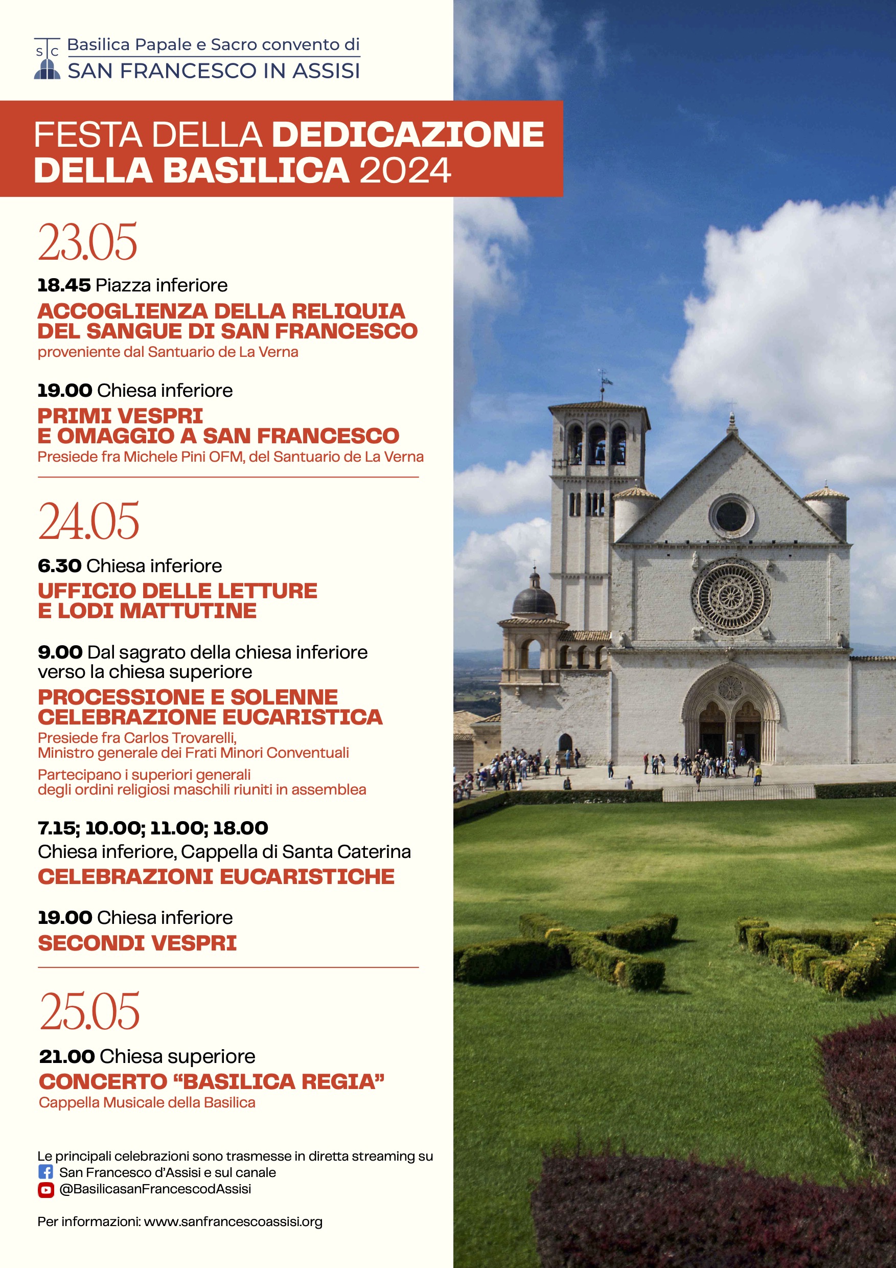 Venerdì 24 maggio, giorno della Dedicazione, alle 9 si terrà la processione dal sagrato della chiesa inferiore verso la chiesa superiore della Basilica, a cui seguirà la celebrazione eucaristica. Presiederà fra Carlos A. Trovarelli, Ministro generale dell’Ordine dei Frati Minori Conventuali, alla presenza dei superiori generali degli ordini religiosi maschili di diritto pontificio riuniti in assemblea in Assisi.
