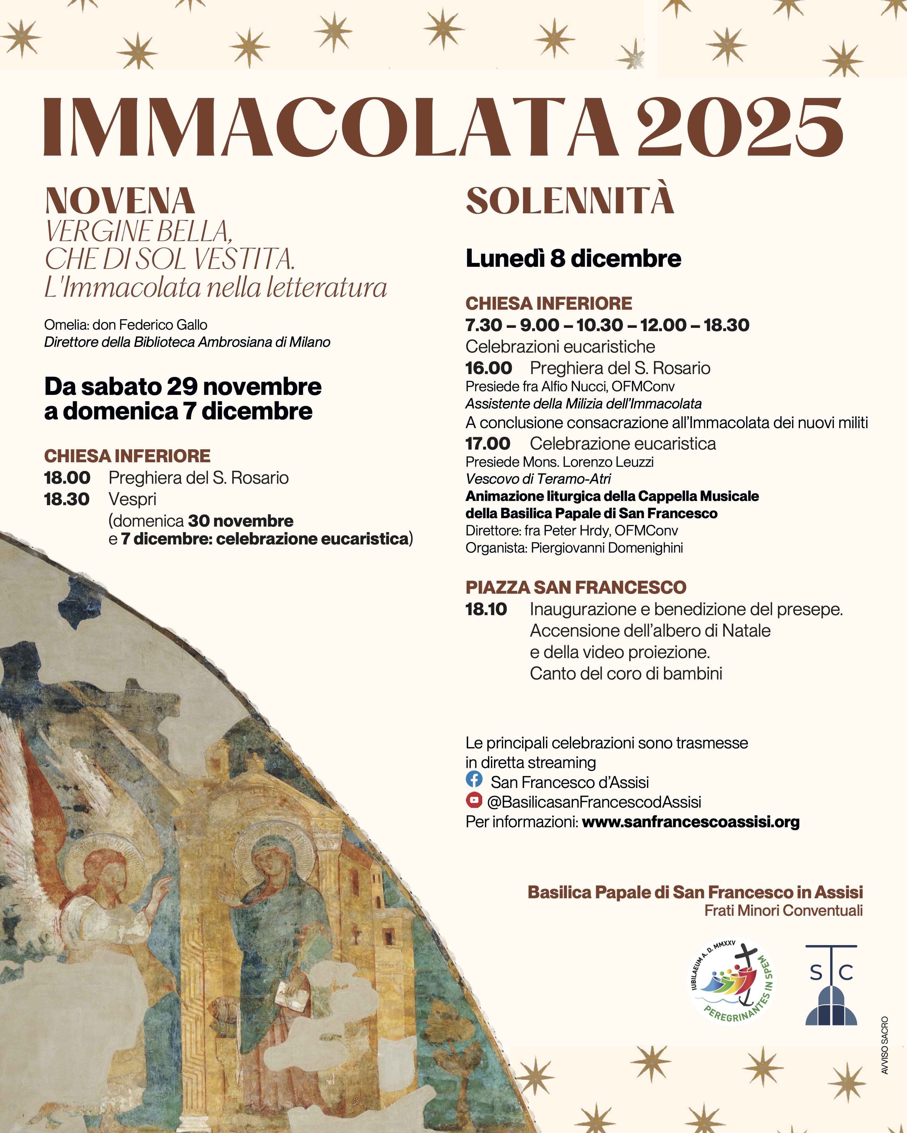 Lunedì 8 dicembre si terrà la tradizionale apertura dei festeggiamenti natalizi presso la Basilica di San Francesco in Assisi. Alle 16, fra Alfio Nucci, OFMConv, Assistente della Milizia dell’Immacolata, presiederà la preghiera del Santo Rosario, al termine della quale si terrà la consacrazione all’Immacolata dei nuovi militi. Subito dopo, alle 17, Mons. Lorenzo Leuzzi, Vescovo di Teramo-Atri e delegato dei Vescovi d’Abruzzo, regione che quest’anno ha offerto l’olio per la Lampada di San Francesco, presiederà la celebrazione eucaristica solenne animata dalla Cappella Musicale della Basilica. Alle 18.10 seguirà in piazza inferiore l’accensione dell’albero di Natale e della videoproiezione sulla facciata della chiesa superiore della Basilica, insieme alla benedizione e all’inaugurazione del presepe. Questo momento sarà animato dal coro delle classi 4 e 5 della Scuola Primaria Sant'Antonio - Istituto Comprensivo "Assisi 1".