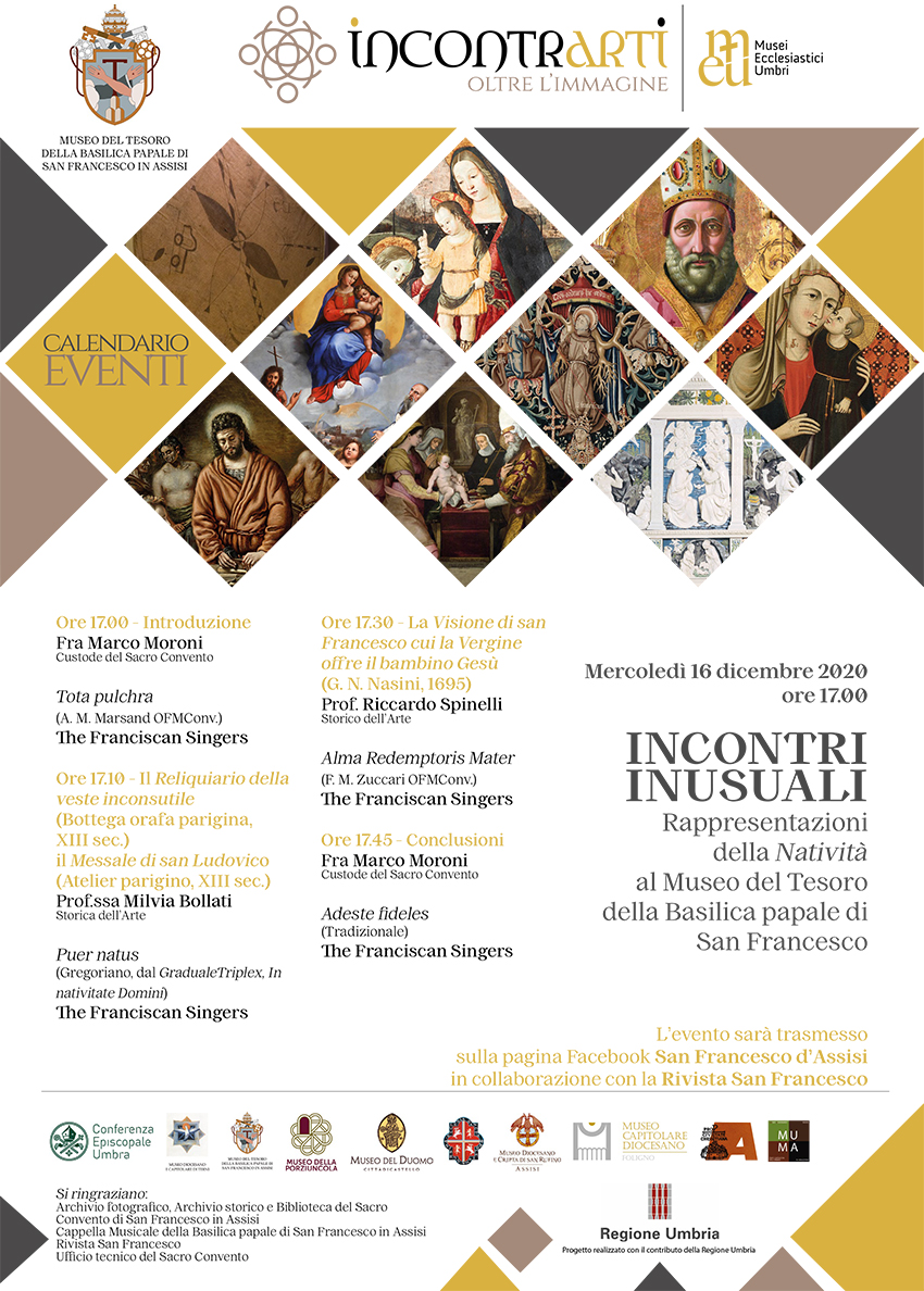 Si terrà mercoledì 16 dicembre alle 17, sulla pagina Facebook San Francesco d’Assisi, l'evento dal titolo “Incontri inusuali: rappresentazioni della Natività al Museo del Tesoro della Basilica papale di San Francesco”. Un insolito percorso natalizio, nel quale verranno illustrate tre singolari rappresentazioni della Natività, correlate alle vicende storiche e ai capolavori artistici per i quali la Basilica di San Francesco è nota in tutto il mondo.