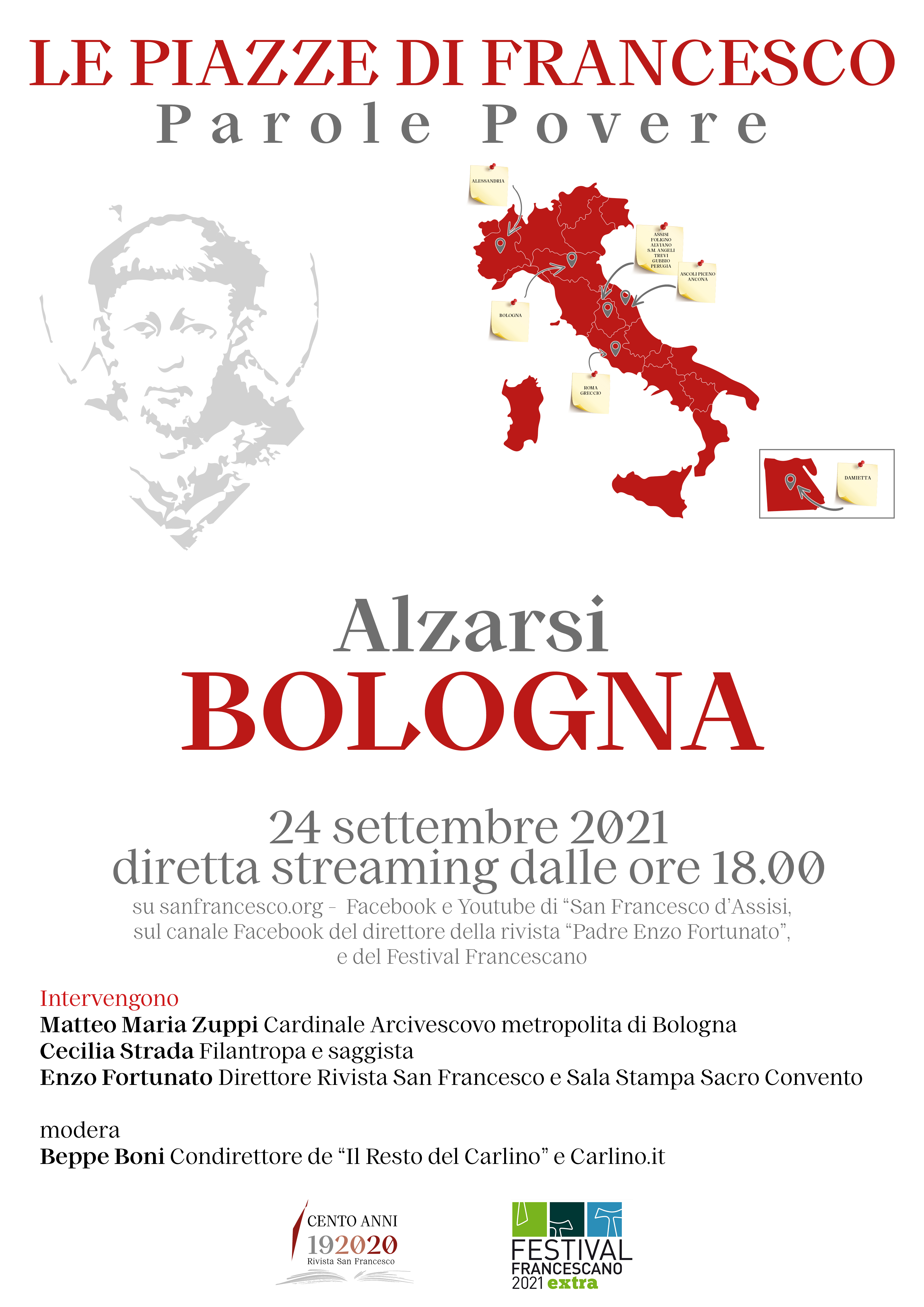 Domani 24 settembre alle 18, in piazza Maggiore a Bologna, in occasione del Festival Francescano si terrà un incontro per i 100 anni della rivista San Francesco su inclusività e povertà con l’Arcivescovo di Bologna, Card. Matteo Maria Zuppi, Cecilia Strada e padre Enzo Fortunato. Ogni mese in dialogo in una piazza diversa d'Italia per celebrare il Santo di Assisi e il suo passaggio. L’appuntamento verrà trasmesso in diretta streaming sul sito sanfrancesco.org e per partecipare all'incontro è necessario iscriversi a questo link: https://www.festivalfrancescano.it/product/parole-povere/ .