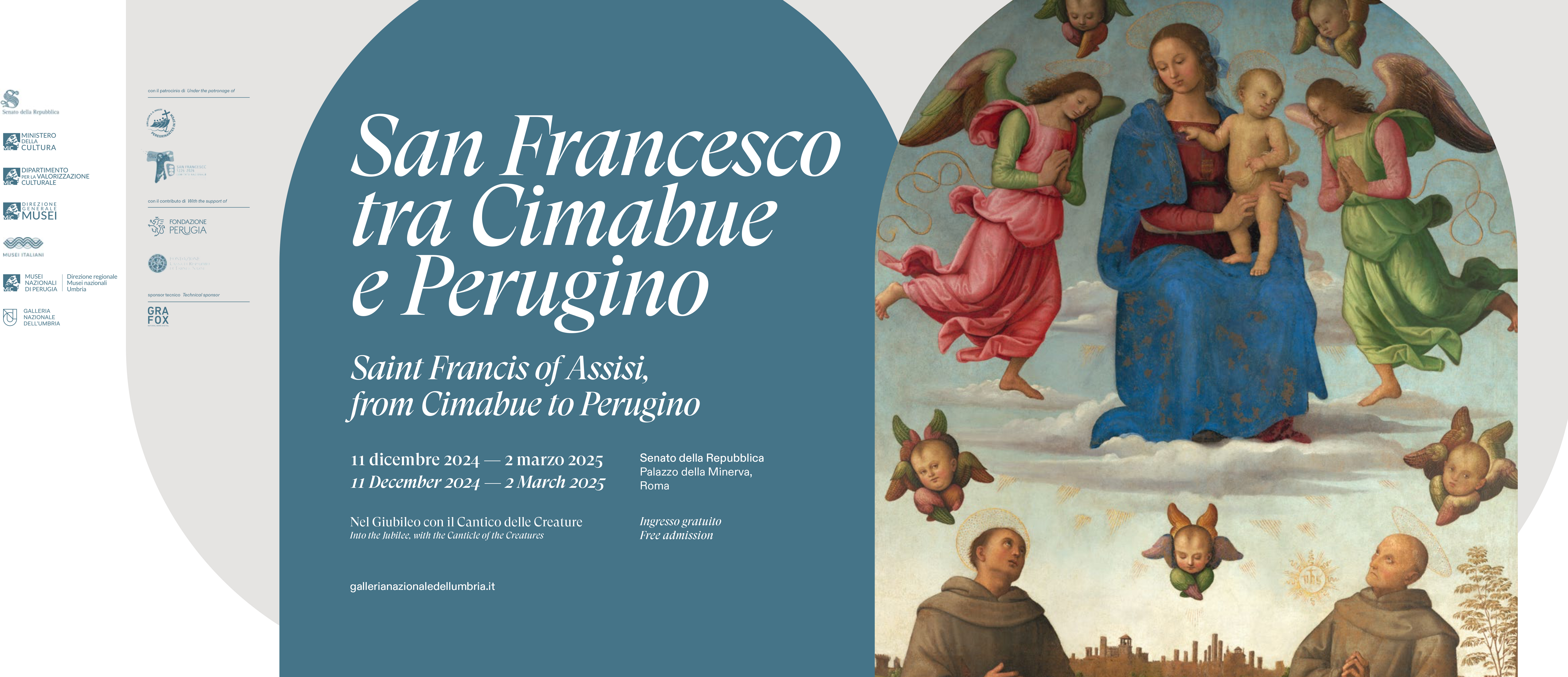 Il 10 dicembre 2024 presso la Sala Capitolare di Palazzo della Minerva, sede della Biblioteca del Senato della Repubblica, alla presenza del Presidente del Senato, on. Ignazio La Russa, e del Sottosegretario di Stato alla Cultura Gianmarco Mazzi, è stata inaugurata la mostra San Francesco, tra Cimabue e Perugino. Nel Giubileo con il Cantico delle Creature, promossa dal Senato della Repubblica in collaborazione con il Ministero della Cultura, Musei Nazionali di Perugia – Direzione regionale Musei nazionali Umbria, che ne cura il progetto scientifico e l’organizzazione. L’esposizione si presenta come una iniziativa che coinvolge diverse realtà istituzionali del territorio umbro, grazie all’eccezionale collaborazione della Custodia Generale del Sacro Convento di San Francesco in Assisi, della Provincia Serafica di San Francesco dell’Umbria e del Comune di Terni, con il contributo del Comitato per le celebrazioni dell’ottavo centenario della morte di San Francesco d’Assisi, della Fondazione Perugia e della Fondazione Cassa di Risparmio di Terni e Narni e il patrocinio del Dicastero per l’Evangelizzazione della Santa Sede.