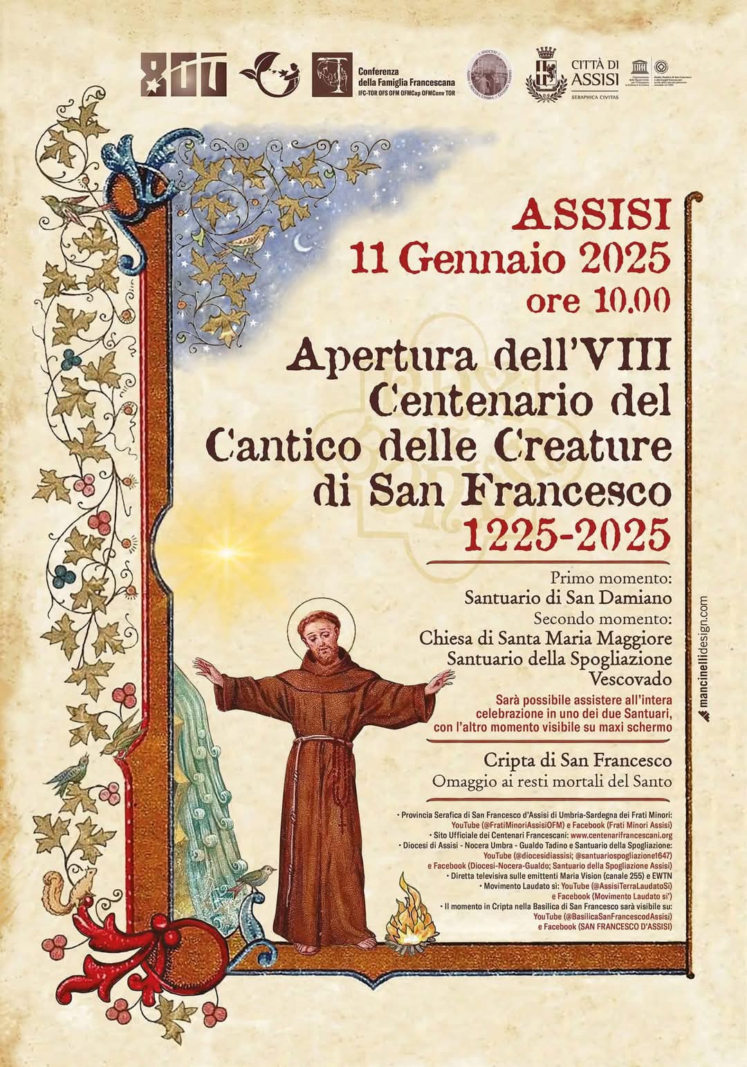 L’evento terminerà con una processione per le strade di Assisi, per recarsi nella cripta nella Basilica di San Francesco, per un omaggio floreale alla tomba del Santo e la benedizione finale dall’altare papale della chiesa inferiore.