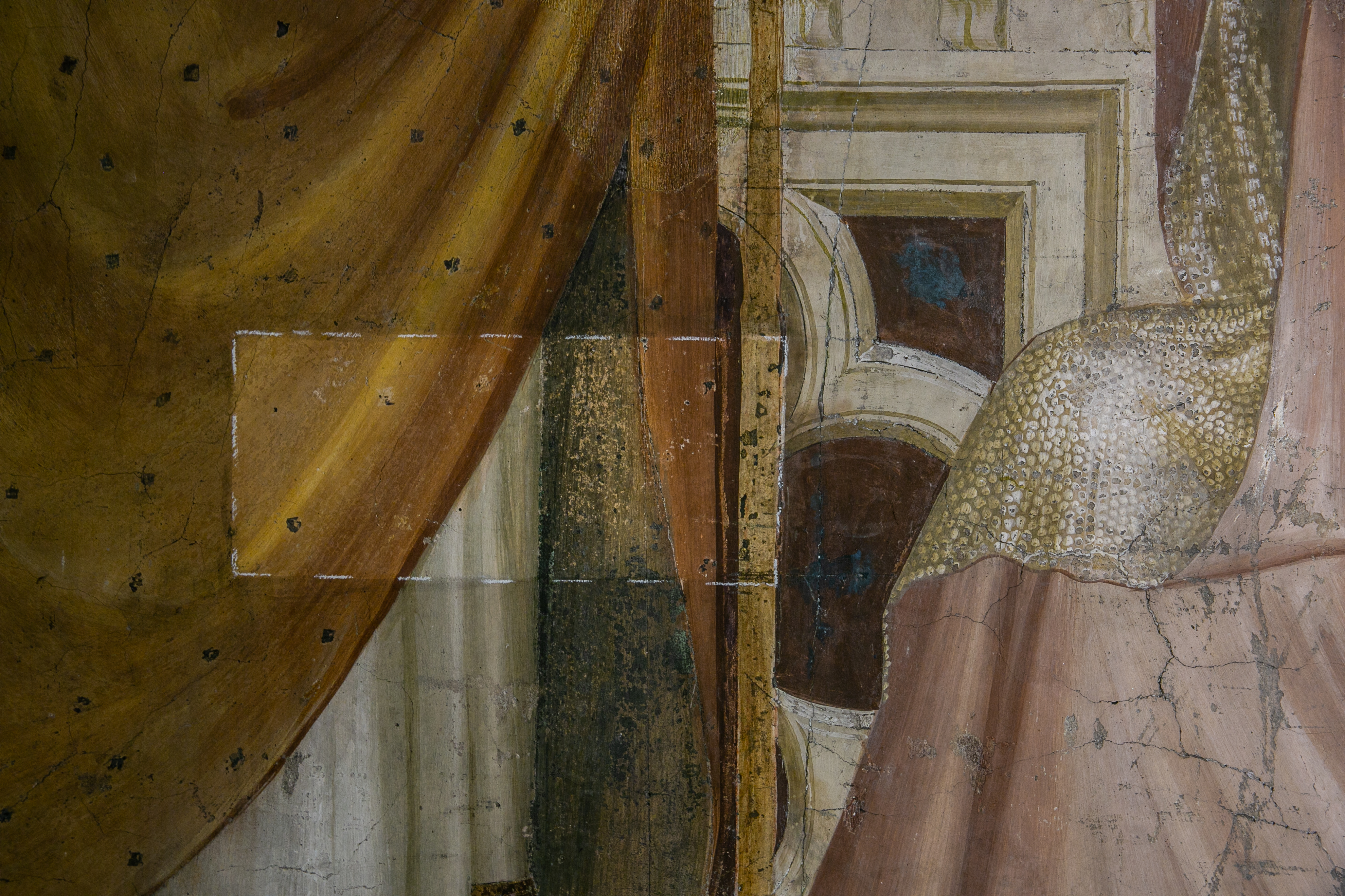 Una delle prime operazioni consiste nella messa in sicurezza degli affreschi iniettando da micro fori l'emulsione di resa acrilica che farà aderire perfettamente l’affresco al supporto sottostante. Le vecchie stuccature (che risalgono a interventi di restauro precedenti) saranno consolidate o rimosse e sostituite con nuove realizzate con malte adeguate e compatibili con i materiali preesistenti. In seguito, verrà eseguita una pulitura a secco tramite spugne per la rimozione della polvere leggermente fissata, della polvere bianca salina e delle ragnatele. Se necessario si usano impacchi con carta giapponese dove lo sporco è più insistente.