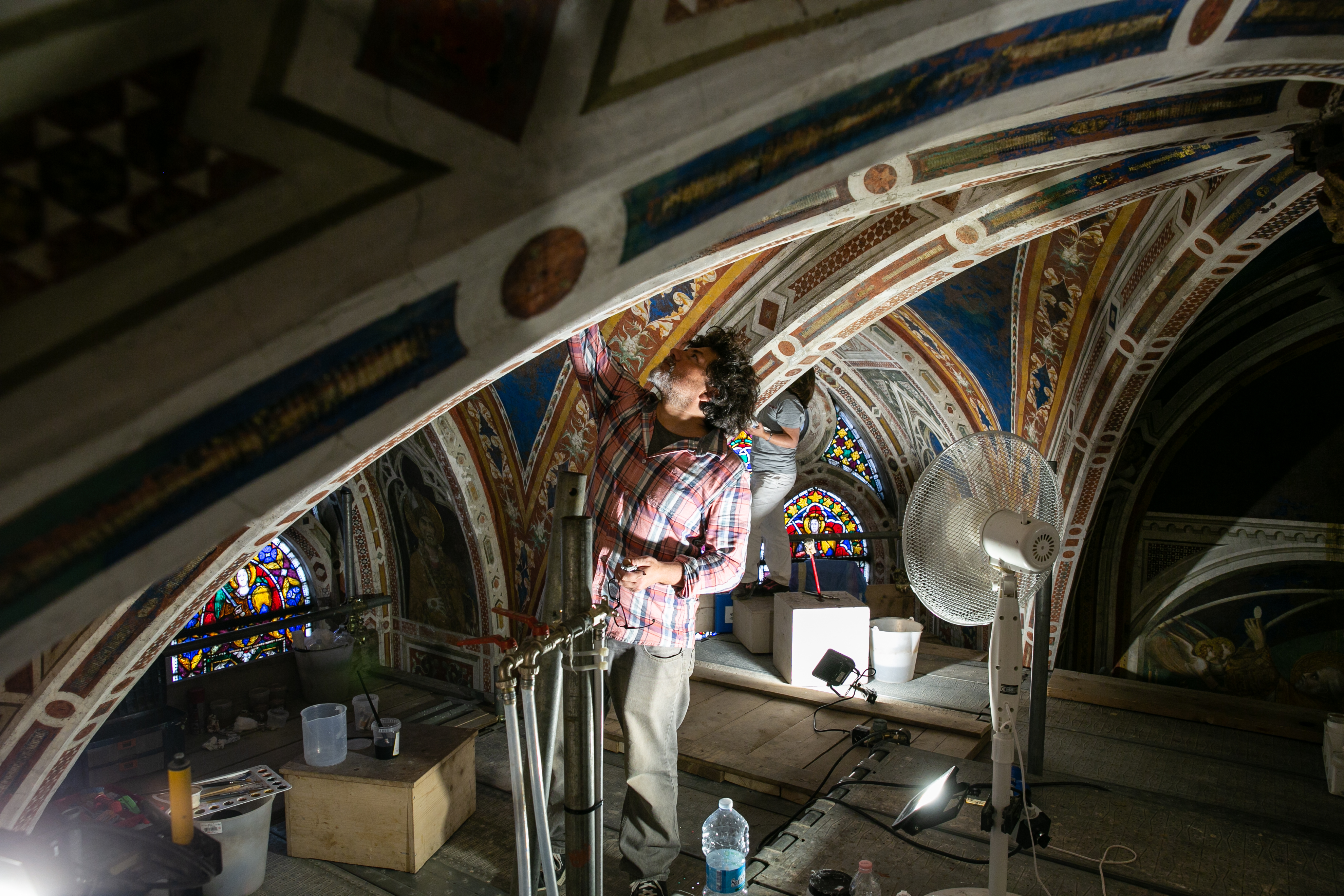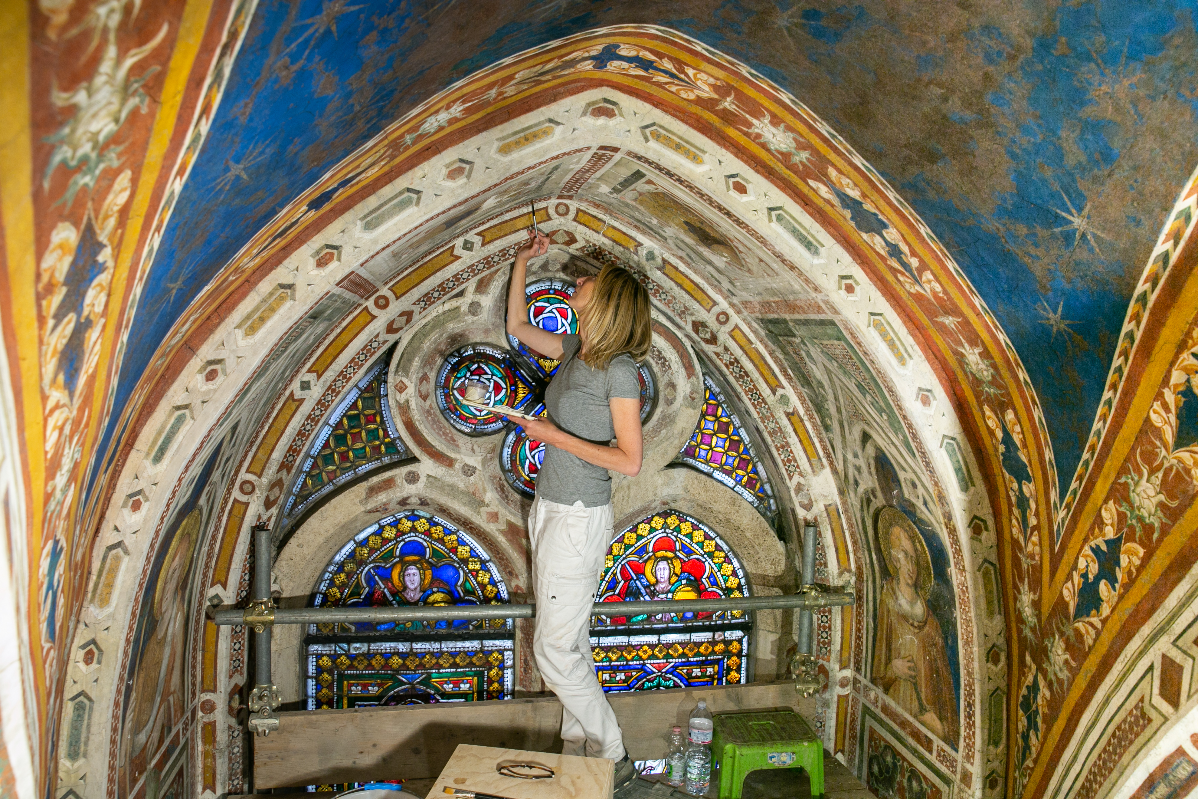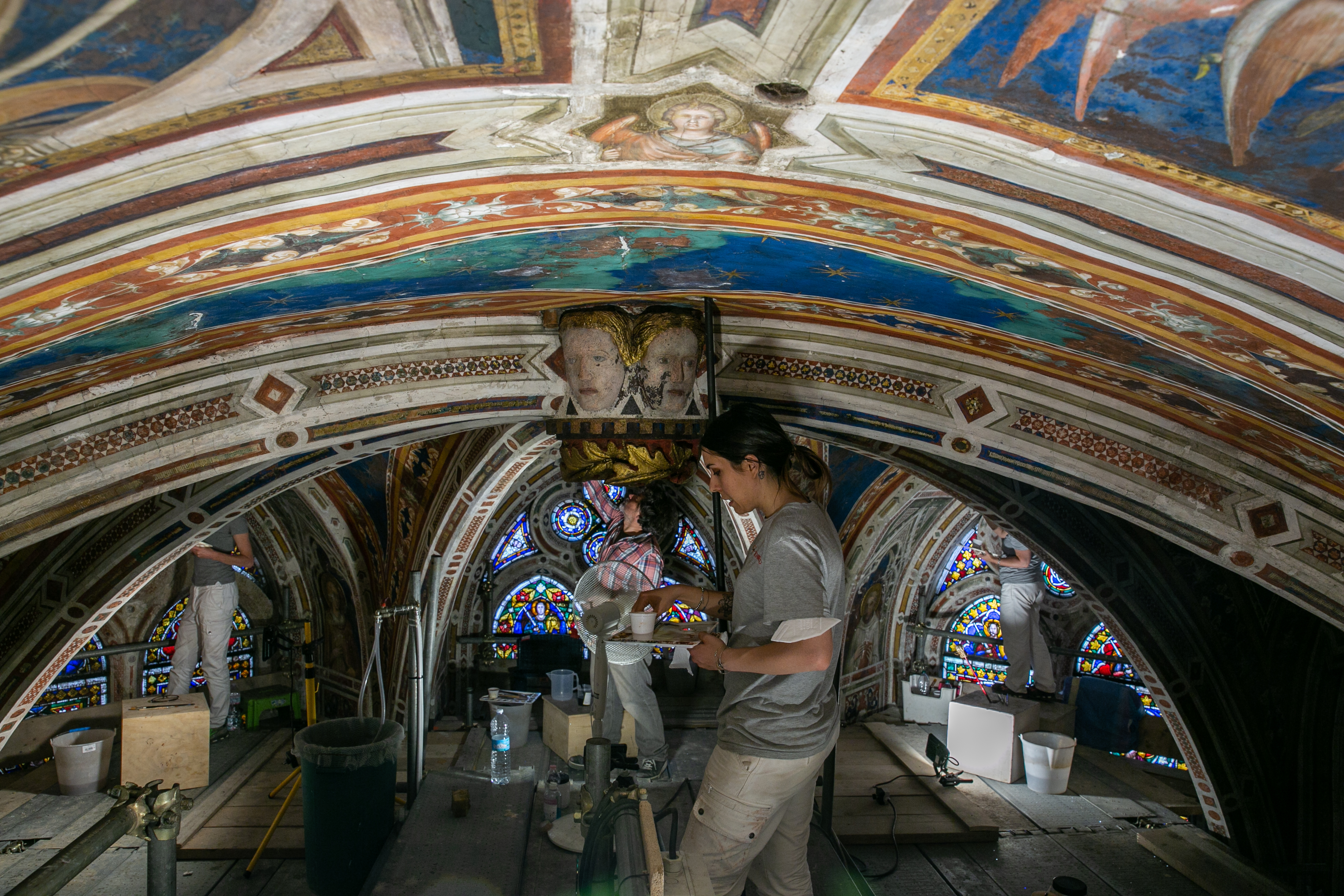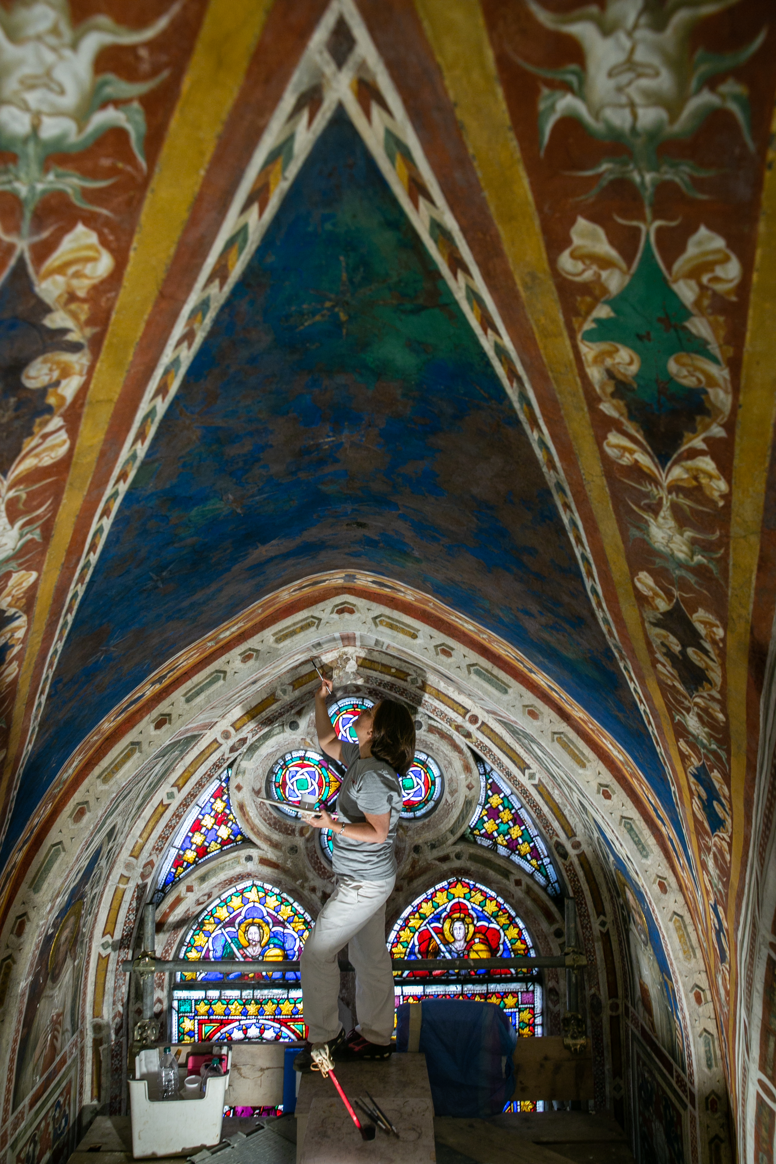 Quali parti sono maggiormente compromesse? «Il ciclo degli affreschi nella fascia più alta ha sofferto un po’ di più perché nel passato ci sono state infiltrazioni d’acqua piovana, bagnando le volte e le pareti superiori. Sono visibili delle efflorescenze. Già si sapeva di alcune lacune, come il volto di san Martino nella scena della Risurrezione di un fanciullo. Si notano dei graffi per l’incuria nelle pulizie eseguite malamente nell’800. I colori sono ancora belli così, ma possiamo solo immaginare come doveva essere con tutte le decorazioni delle volte a foglia d’oro su sfondo blu».