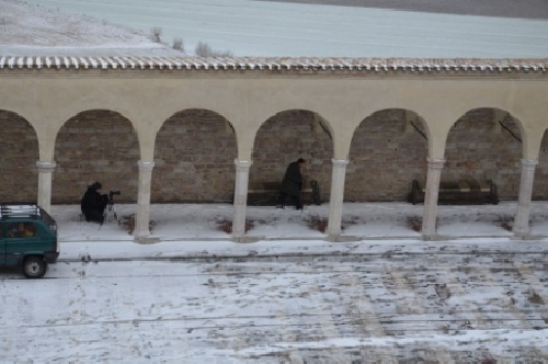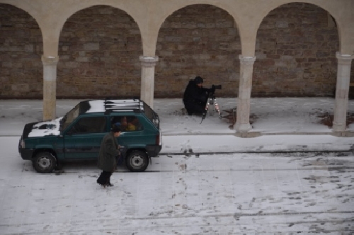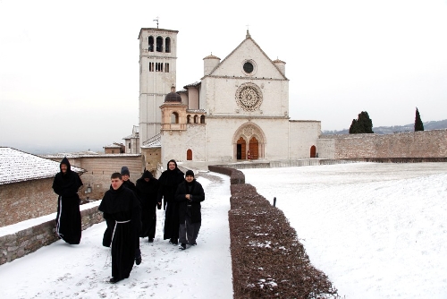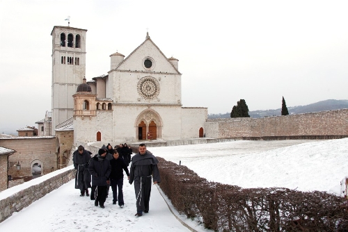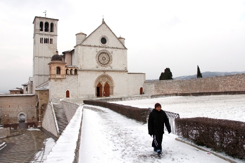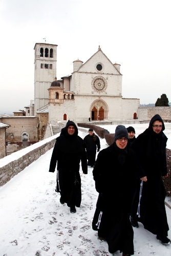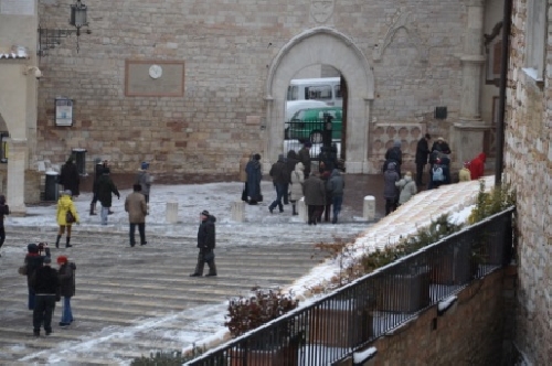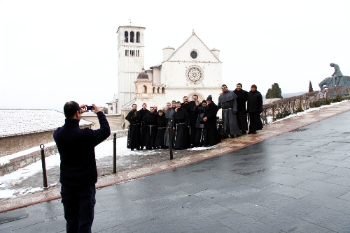 Assisi, Frati e pellegrini sfidano la neve davanti la Basilica di San Francesco