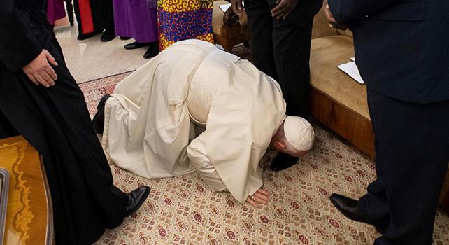 Papa si inginocchia e invoca pace in Sud Sudan (VIDEO)