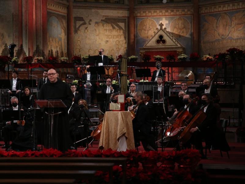 Questa ricorrenza del Concerto di Natale, che negli altri anni era particolarmente gioiosa e festosa, quest’anno è segnata, così come ogni nostra esperienza quotidiana, dalla pandemia da Covid 19, dalla perdita di tante vite, dalle misure precauzionali che impongono di evitare ogni assembramento di persone. Ne è testimonianza il fatto che questa stessa Basilica accoglie oggi solamente il personale tecnico e gli artisti che saluto: il tenore Andrea Bocelli, accompagnato dall’orchestra del teatro Carlo Felice di Genova diretta dal Maestro Steven Mercurio, la violinista Anastsiya Petrishak e il soprano Clara Barbier Serrano.