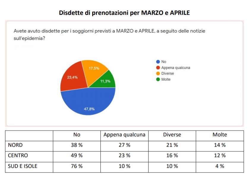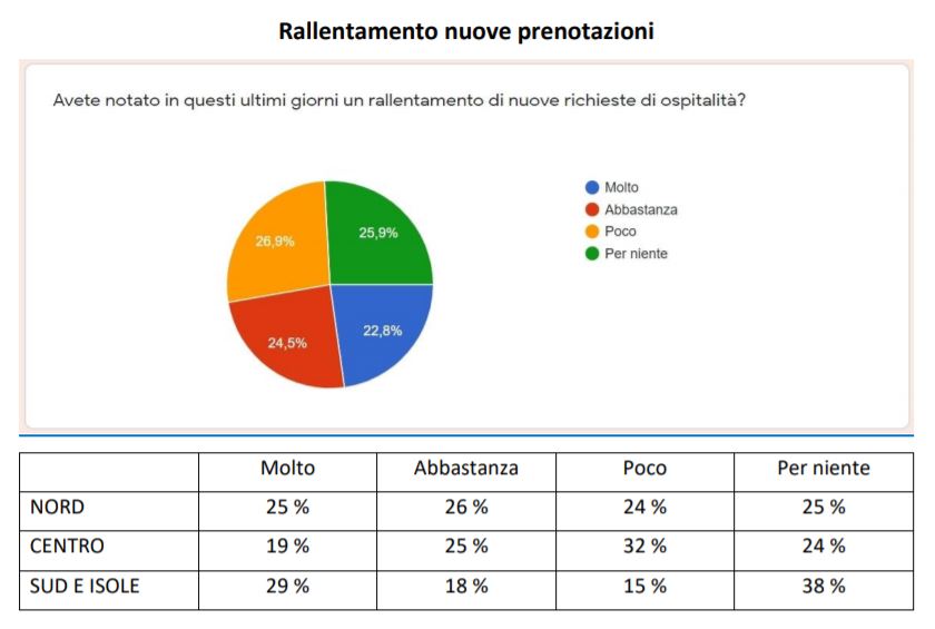 E chi ha già prenotato, come si sta muovendo? Il 44% delle strutture è stato contattato con richieste di rassicurazione o dubbi sull'effettivo soggiorno, con punte del 49% nel Nord.