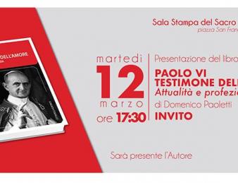 Verrà presentato, oggi 12 marzo alle 17.30, nella Sala Stampa della Basilica di San Francesco d’Assisi il libro “Paolo VI, testimone dell’Amore” scritto dal Vicario del Sacro Convento di Assisi, padre Domenico Paoletti. Saranno presenti all’incontro, oltre l'autore, l’onorevole Fausto Bertinotti, il teologo Piero Coda, e il sociologo Luca Diotallevi. L’evento moderato dal direttore della Sala Stampa, padre Enzo Fortunato, verrà aperto dai saluti del Custode del Sacro Convento di Assisi, padre Mauro Gambetti, e dal Presidente della Pro Civitate Christiana, padre Tonio Dell’Olio.