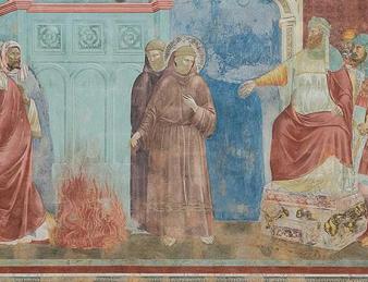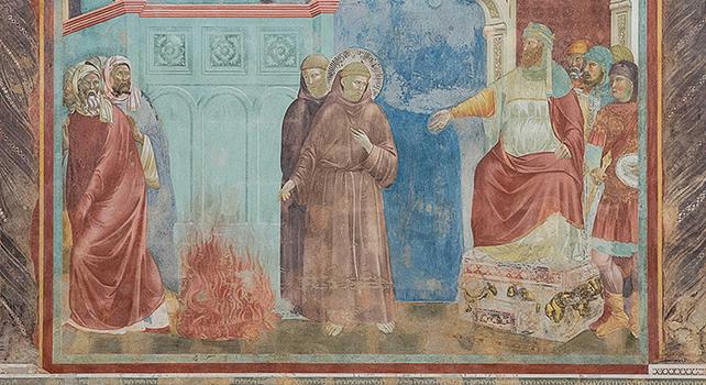 A incrociarsi non sono gli sguardi di Francesco e del sultano, ma quelli del sultano e dei suoi sacerdoti: l’espressione dei religiosi, accortisi di essere stati notati dal loro signore, osservati anche dal compagno che è alle spalle di Francesco, sembra tradire non tanto la paura del fuoco, quanto la vergogna per la pusillanimità mostrata in un momento tanto solenne. Francesco, invece, fissa i propri occhi sul sultano, indicando con la destra il fuoco che è alle sue spalle.
