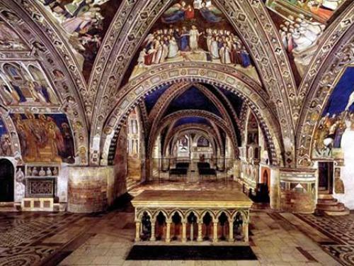 Lo si vede soprattutto d'estate, quando il sole è sufficientemente alto per illuminare l'interno della chiesa inferiore, nell'ora dorata del tramonto. Il fenomeno doveva essere molto più vistoso prima che Sisto IV facesse costruire il chiostro retrostante l'abside, che con le sue arcate impedisce ai raggi del sole di raggiungere l'interno del braccio meridionale del transetto. Perché altrimenti sarebbe stato dato il titolo di "Madonna dei tramonti" all'immagine della Madonna col Bambino che Pietro Lorenzetti dipinse all'altare di San Giovanni Evangelista sotto la grande Crocifissione? Sulla parete che fa angolo, Lorenzetti dipinse una finta panca con un bracciolo che proietta un'ombra dipinta che sembra vera. Un gioco di ombre portate che s'intreccia tra un finto oggetto e la luce vera entrata dalla porta finestra per la quale si accede al convento. Un gioco umano, troppo umano per richiamare un significato divino.