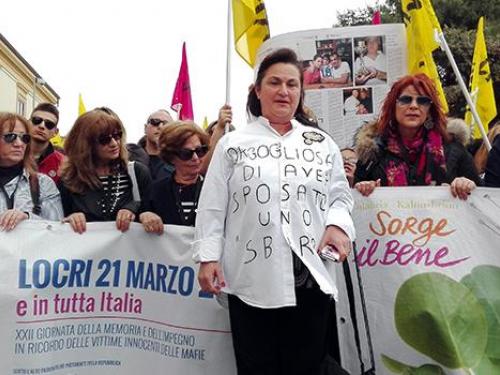 In testa al corteo i familiari delle vittime che reggono due striscioni di Libera con lo slogan della Giornata di quest'anno: "Luoghi di speranza, testimoni di bellezza". Dietro di loro una grande bandiera della pace portata da ragazzi migranti minorenni giunti in Calabria a bordo di barconi nei mesi scorsi. A seguire i gonfaloni, le autorità e migliaia di persone giunte da tutta Italia."Orgogliosa di avere sposato uno sbirro". É la scritta che la vedova del brigadiere Antonino Marino, ucciso a Bovalino il 9 luglio del 1990, ha scritto sulla propria camicia bianca con la quale sta marciando a Locri nel corteo di Libera. "Quando ho visto le scritte di ieri - ha detto - mi sono arrabbiata, mi si è rivoltato lo stomaco. Da qui l'impulso di fare questa maglietta. Sono moglie e mamma di un carabiniere e oggi mi sento la mamma di tutti i carabinieri d'Italia. Gli sbirri sono persone perbene. Rispetto!".
