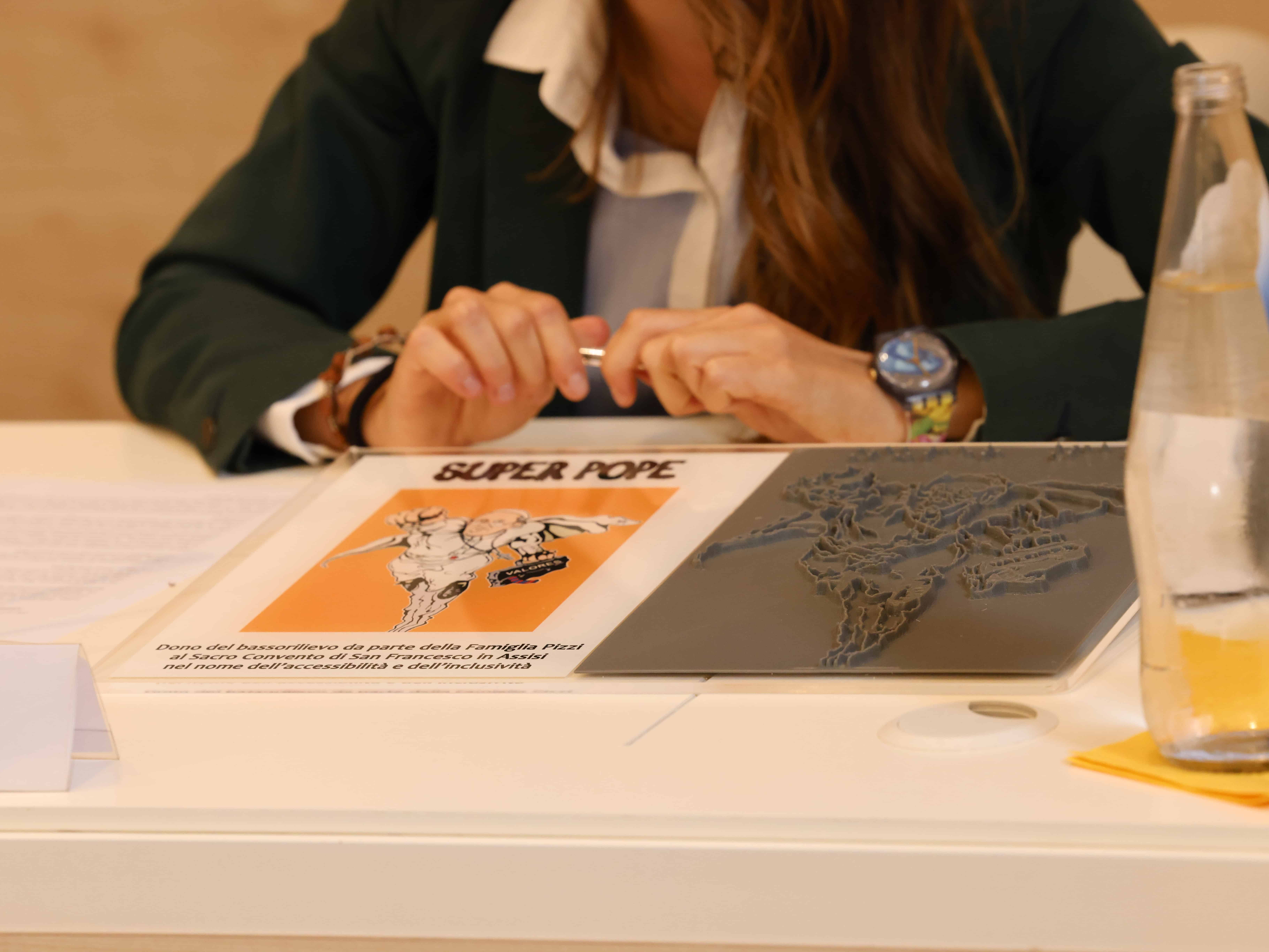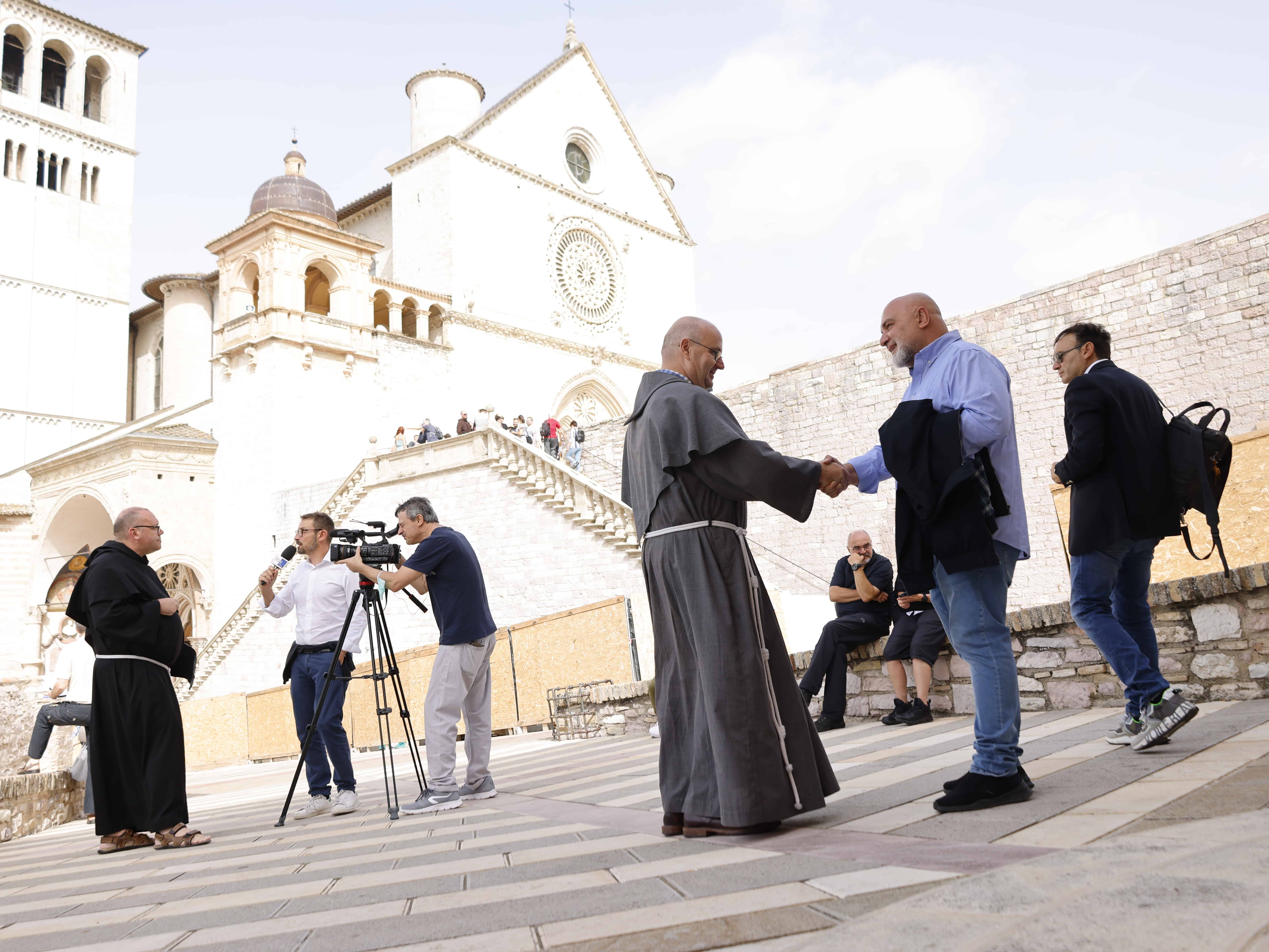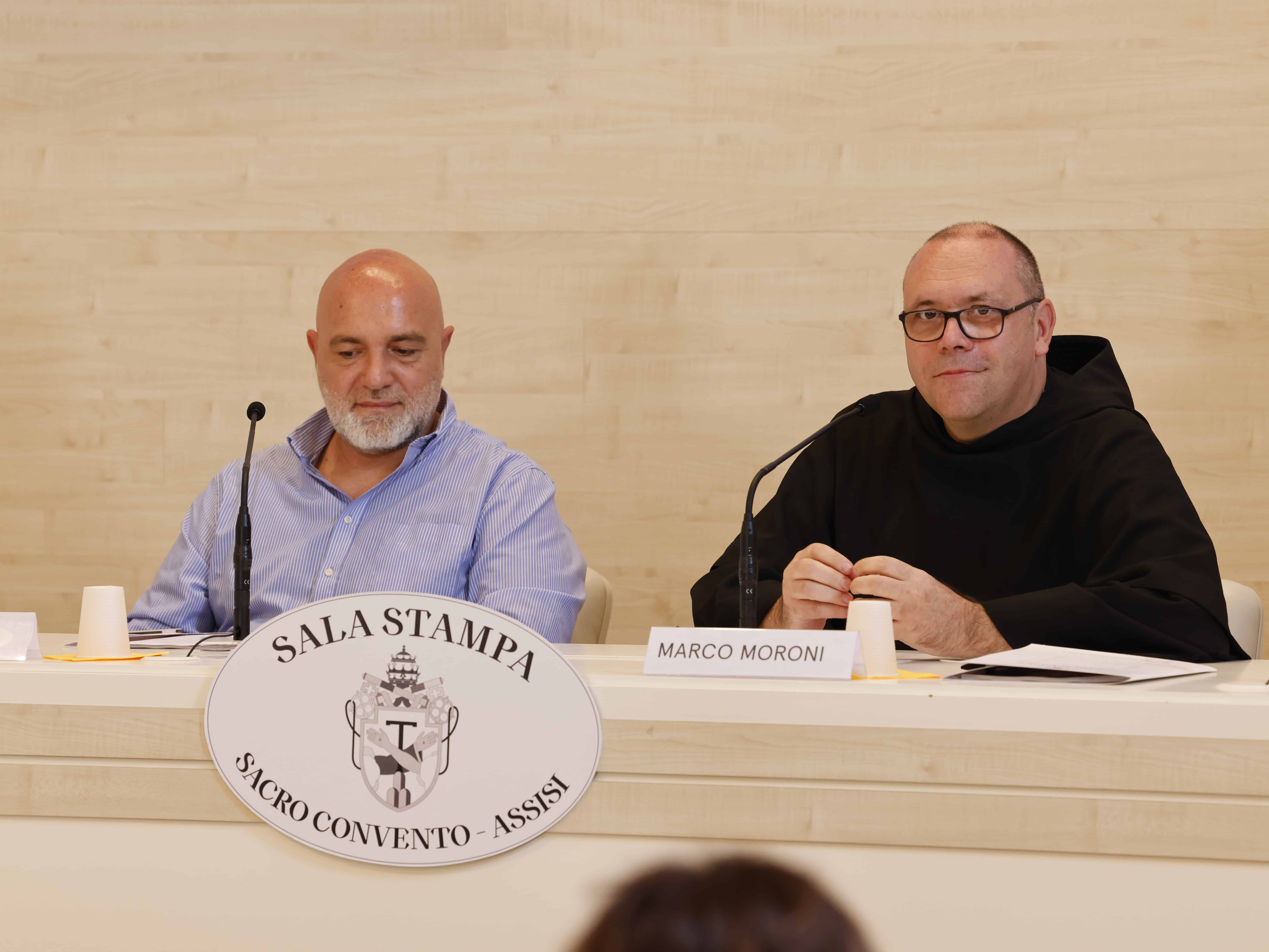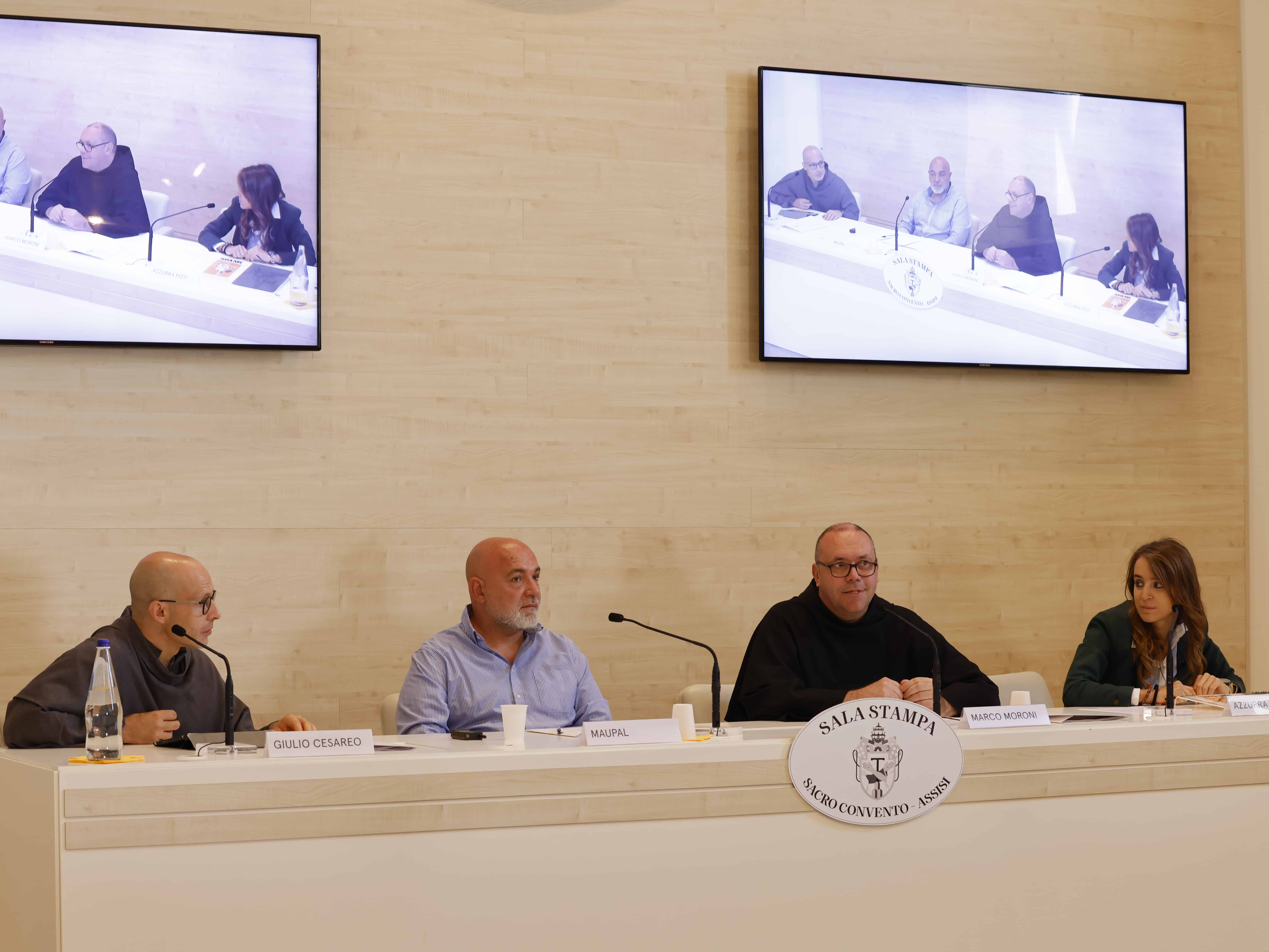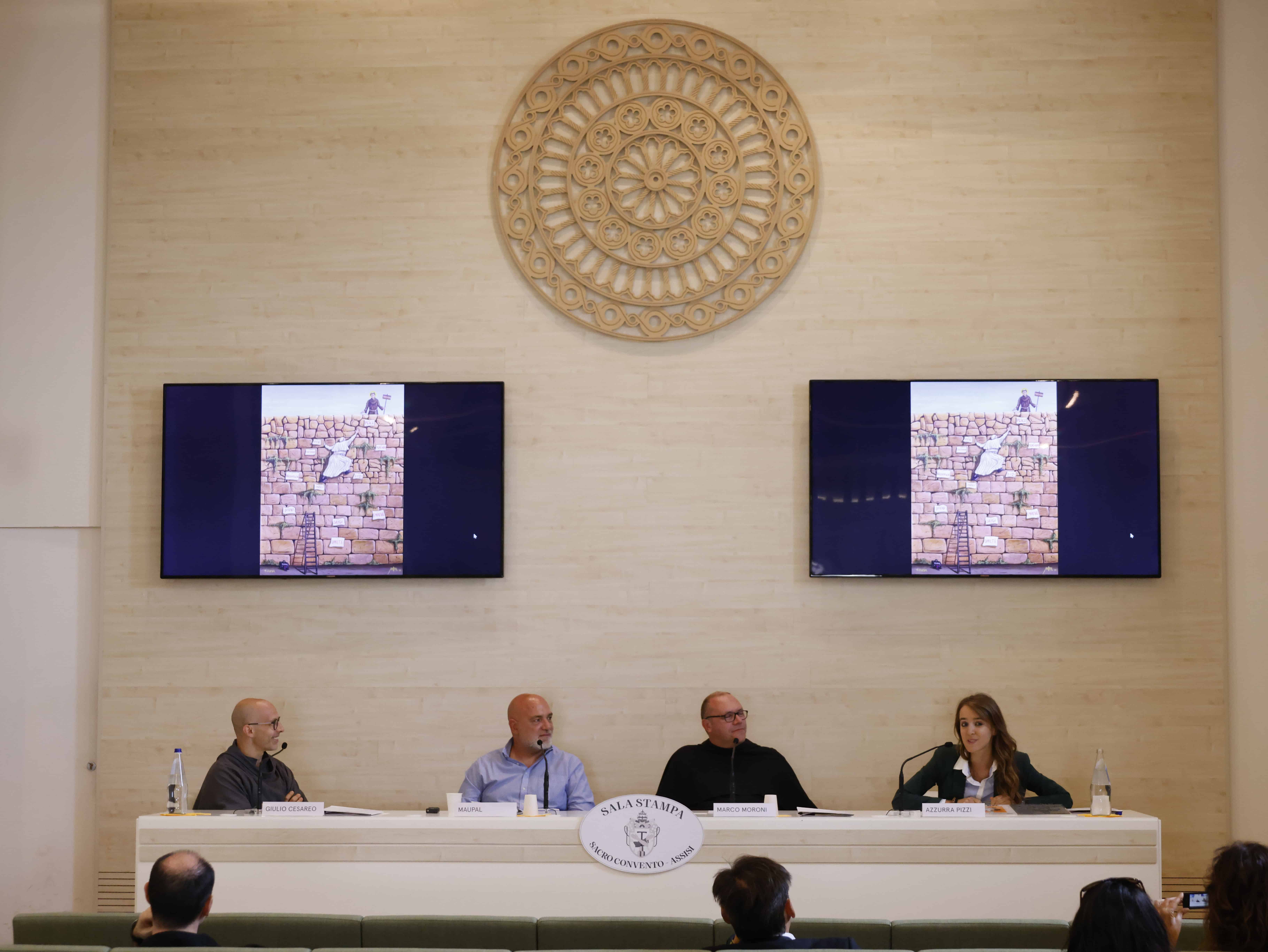 All’incontro moderato dal direttore dell’Ufficio Comunicazione del Sacro Convento di Assisi, fra Giulio Cesareo OFMConv, hanno partecipato il Custode del Sacro Convento, fra Marco Moroni OFMConv, l’artista Maupal e la curatrice della mostra Azzurra Pizzi.