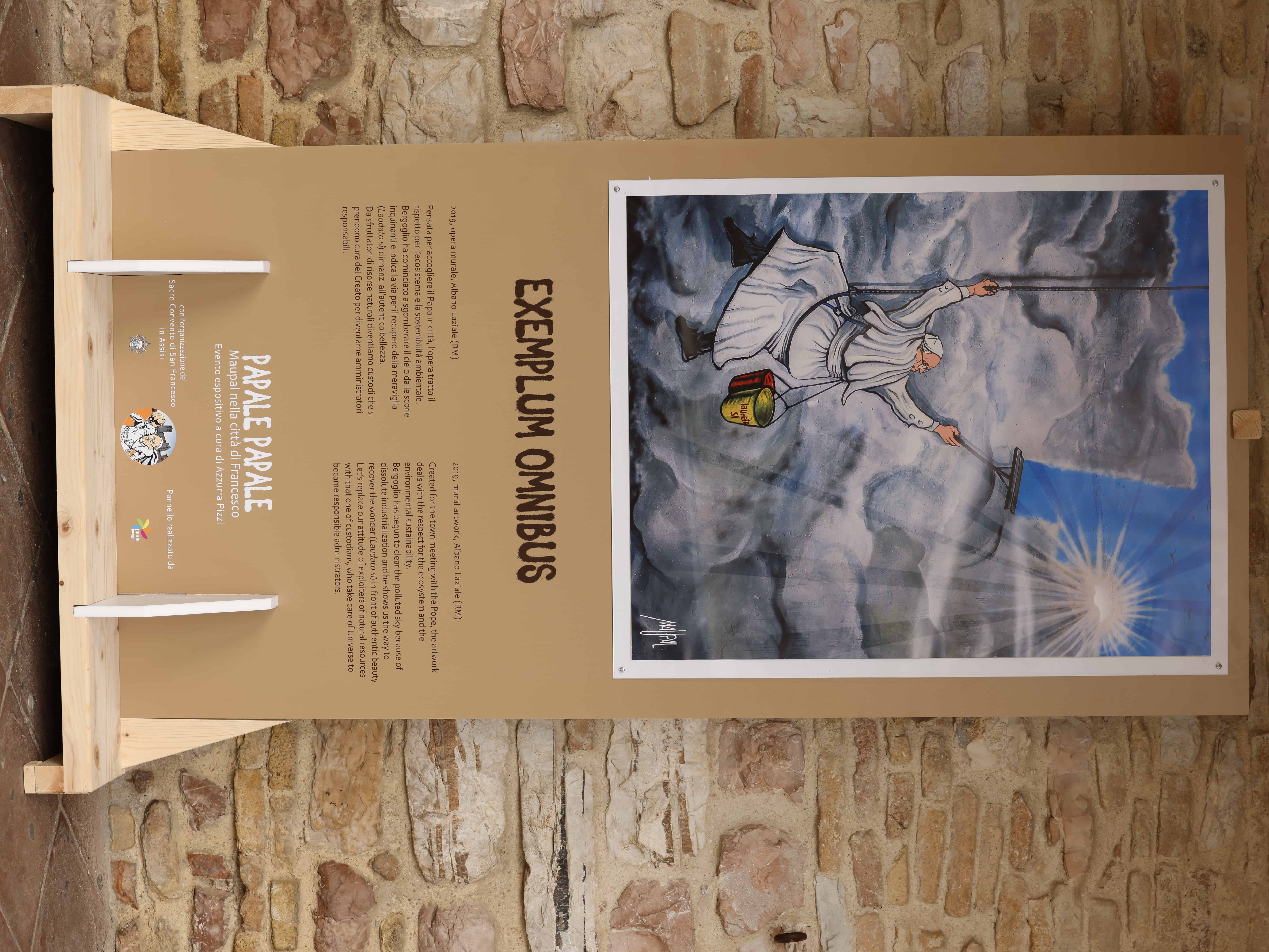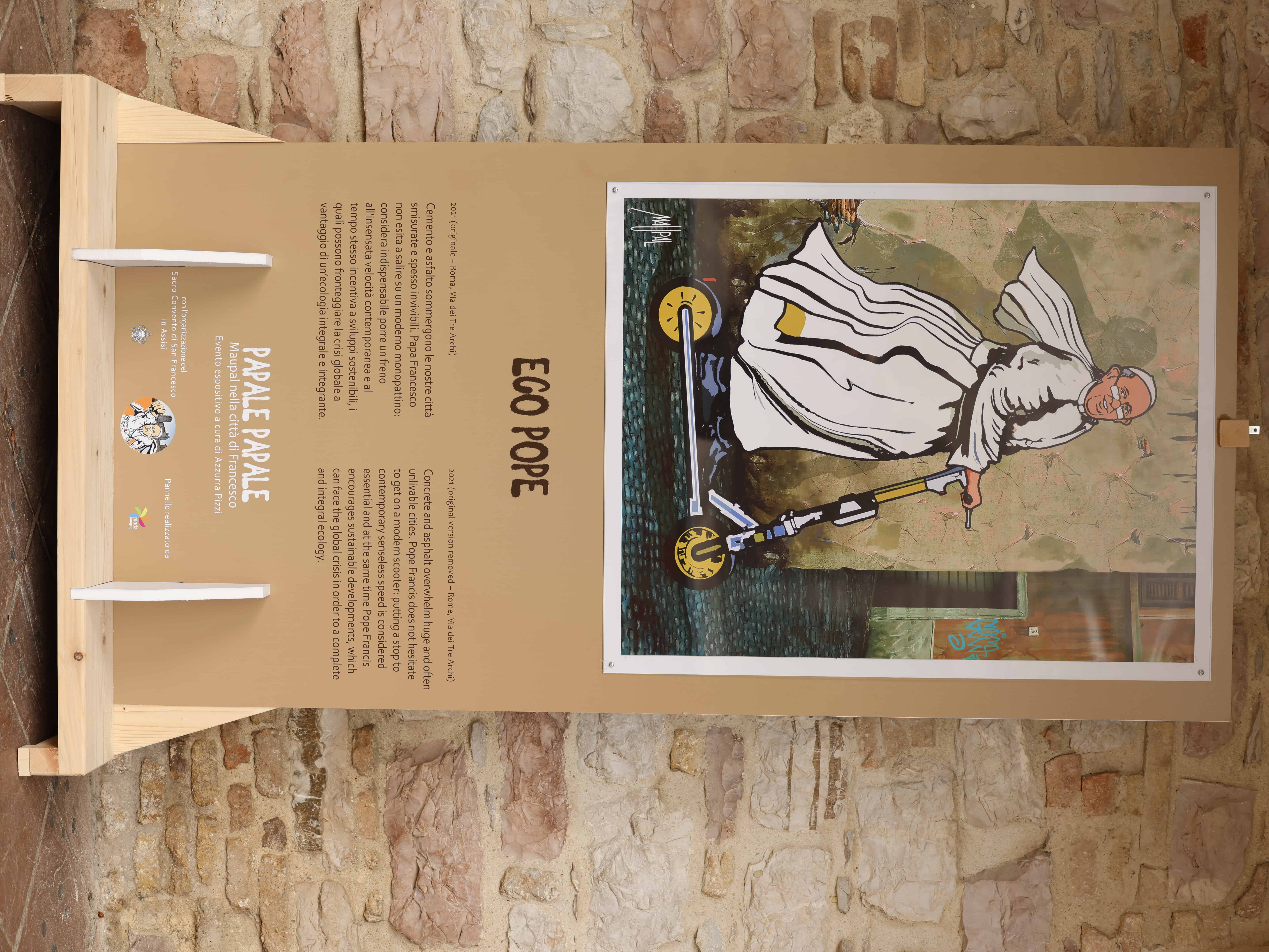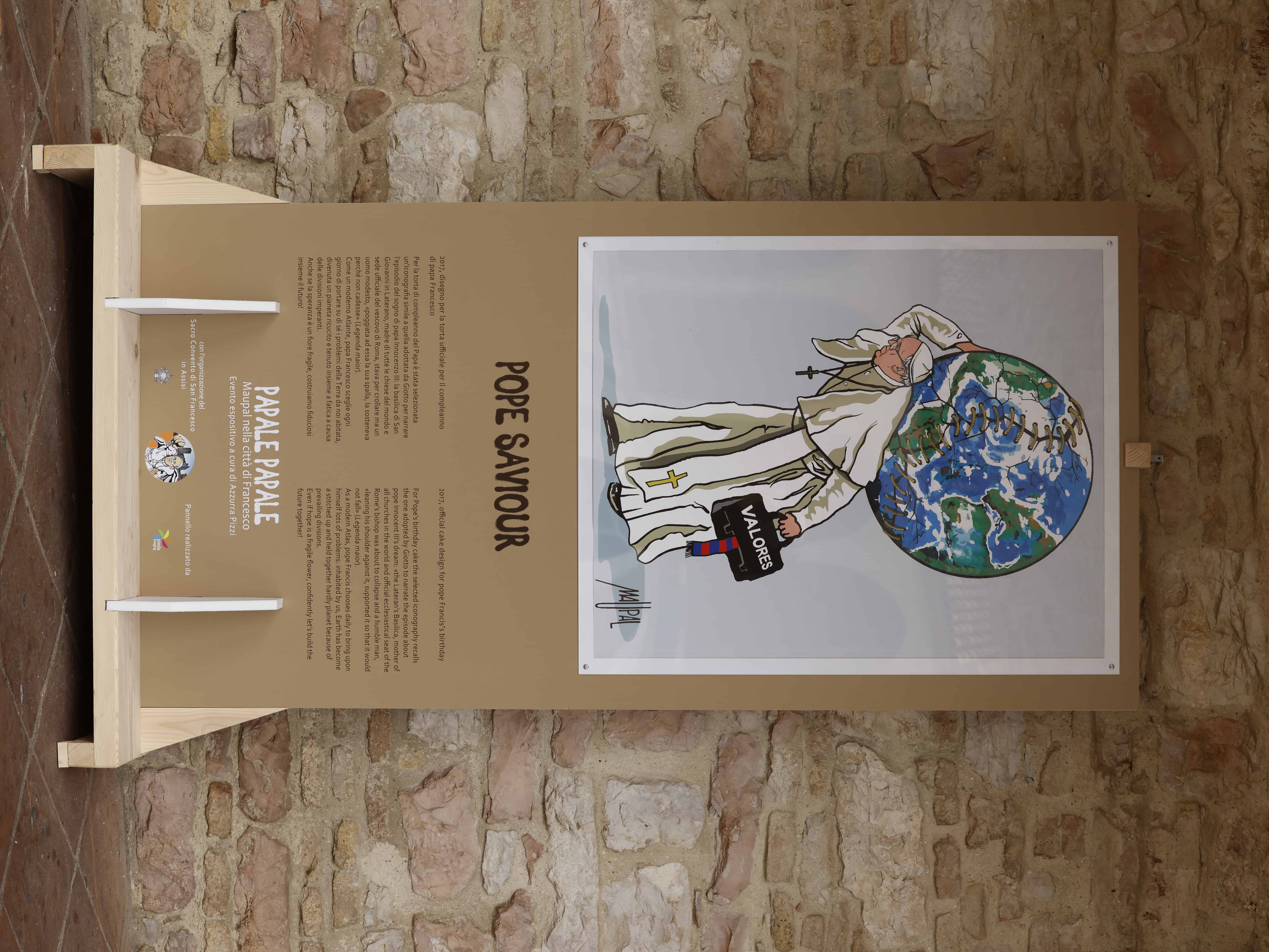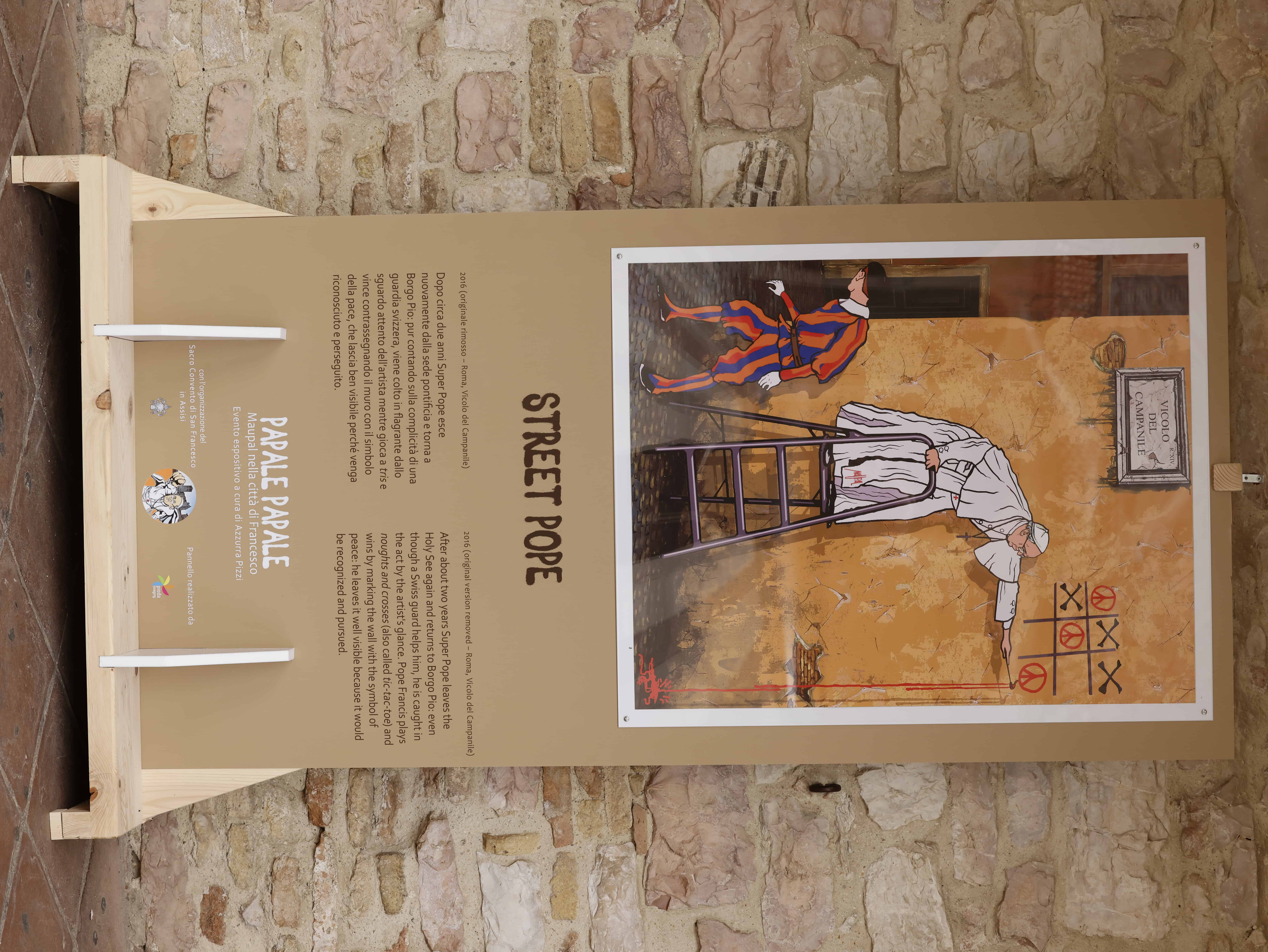 Tra le opere in esposizione: Super Pope (papa Francesco supereroe), Street Pope (il Papa che gioca a tris e vince con il simbolo della pace), Pope Saviour (il Papa porta su di sé il pianeta terra), Pope and Love, Papale Papale, Exemplum Omnibus, Eco Pope, Pope's Golf e Via della Pace. Per l’occasione è stata donata ai frati della Basilica di San Francesco un’opera inedita ispirata al Santo di Assisi dal titolo MURUM che è esposta nel Museo Tesoro della Basilica.