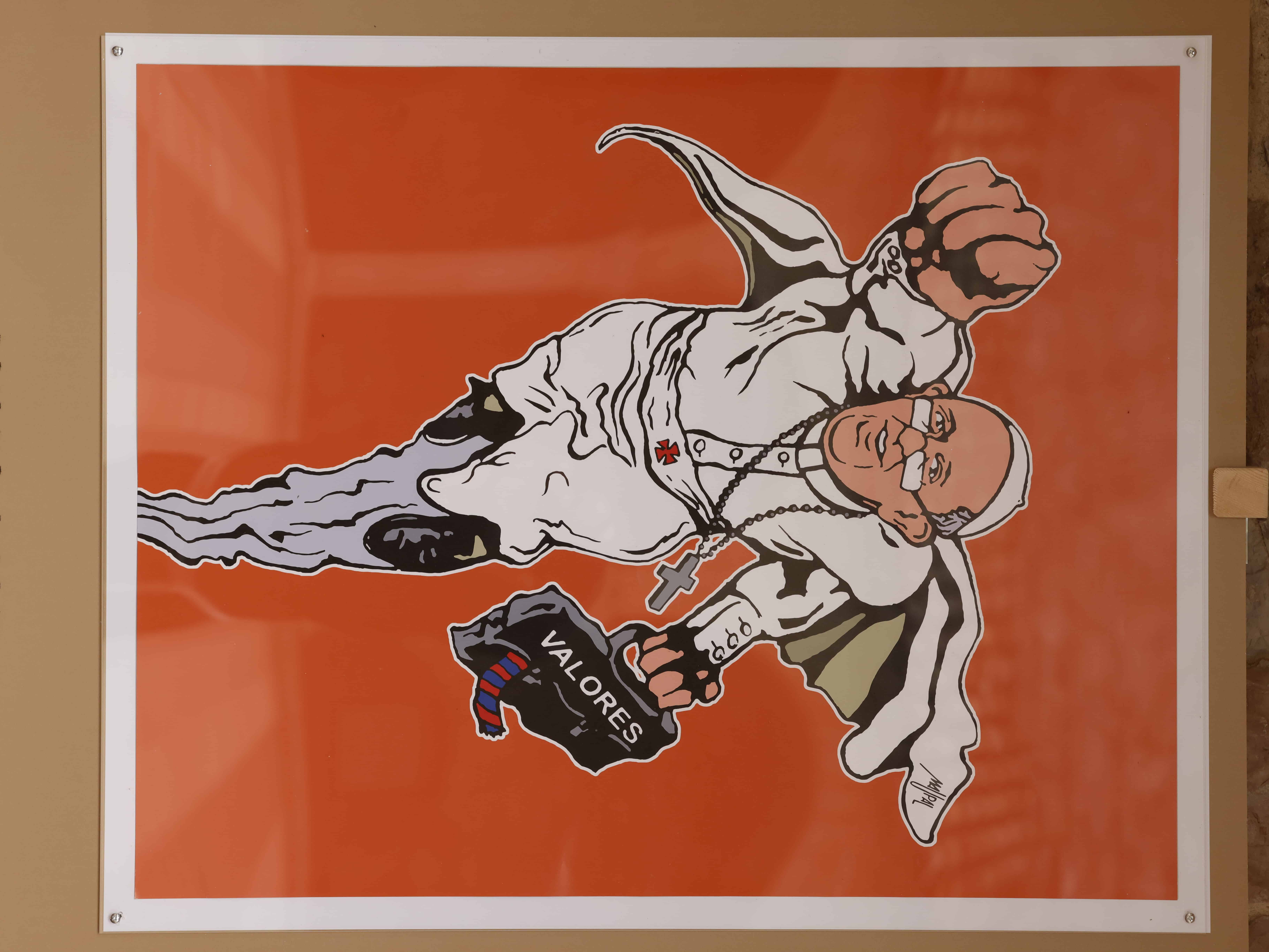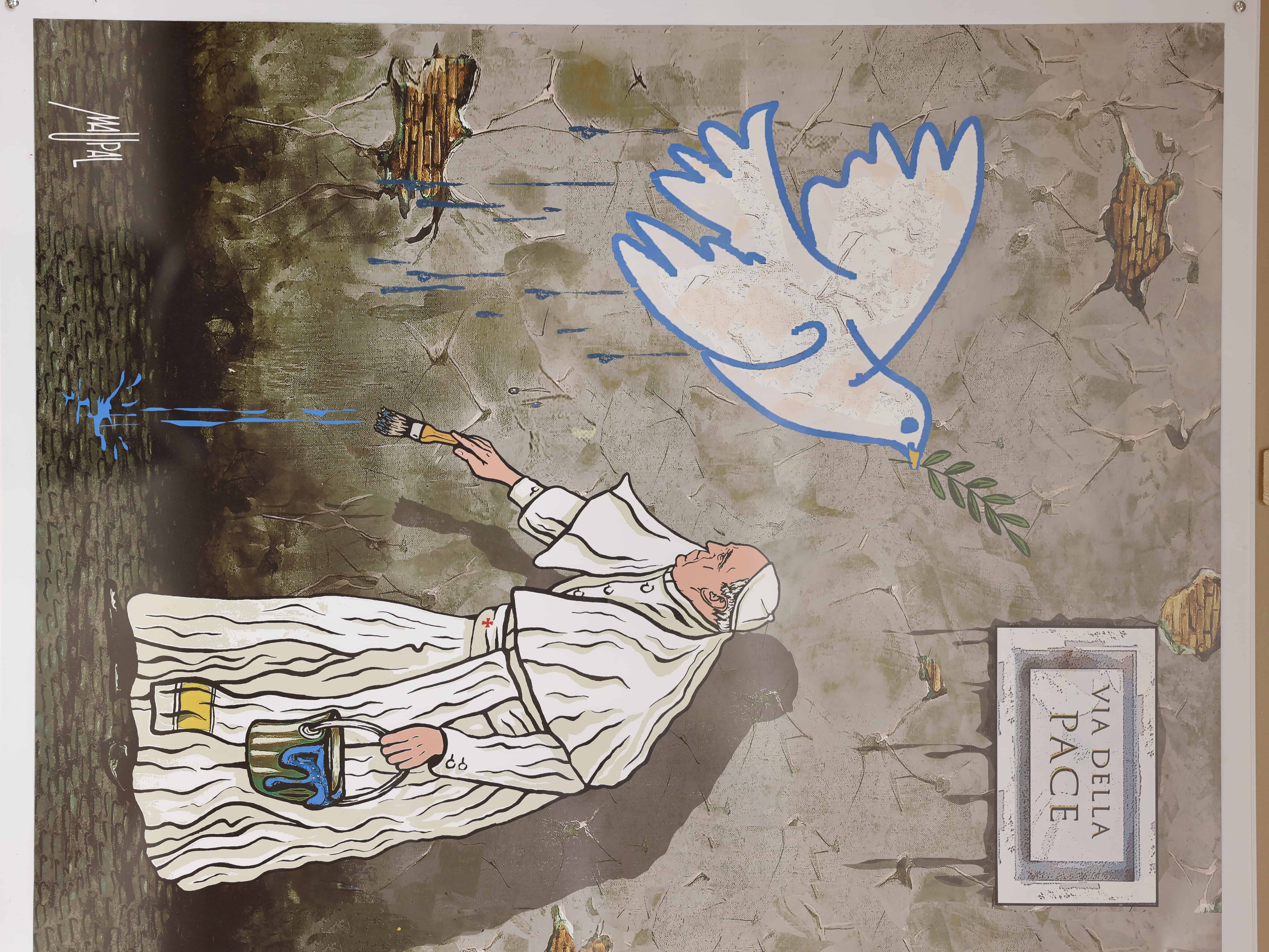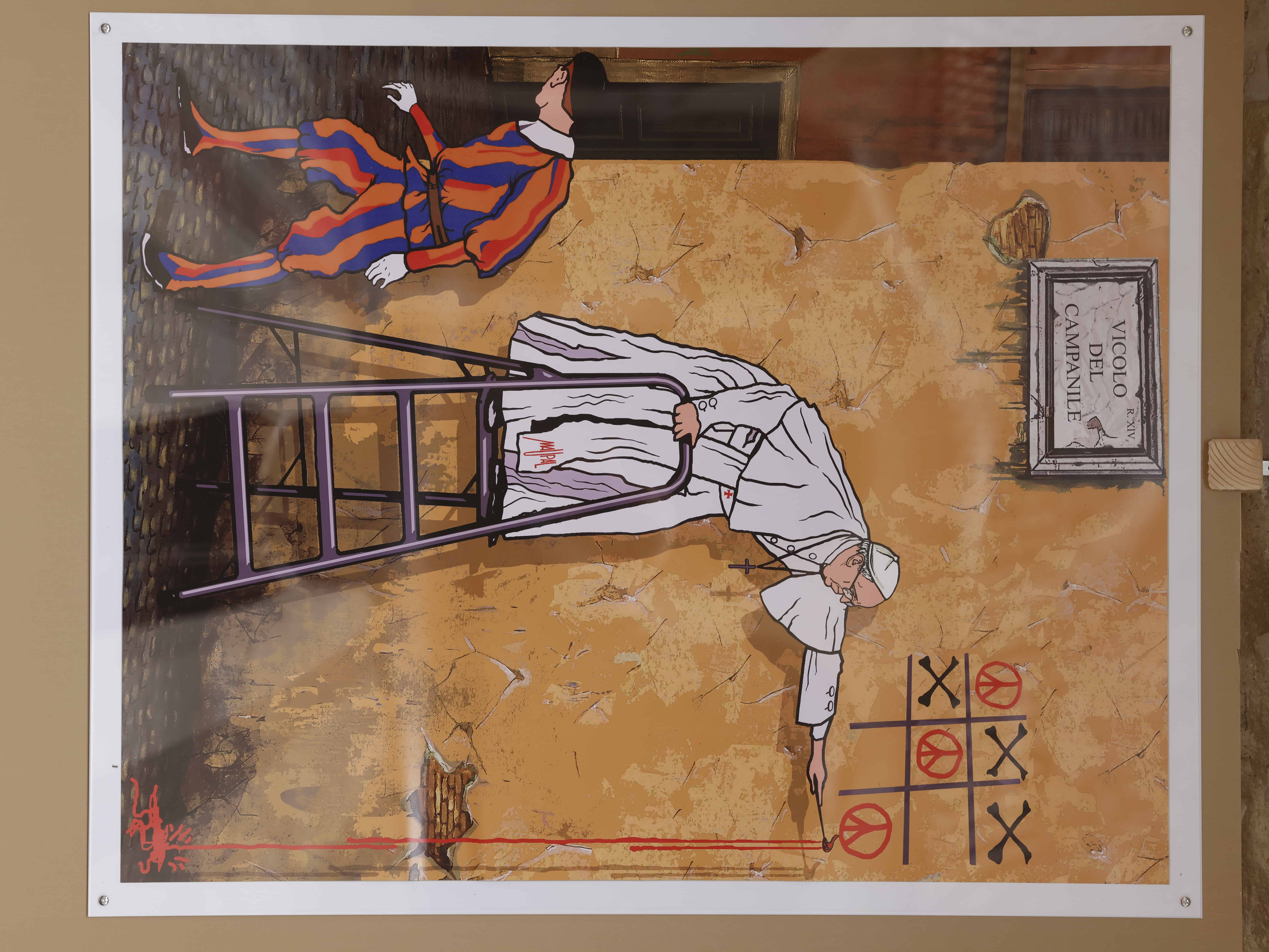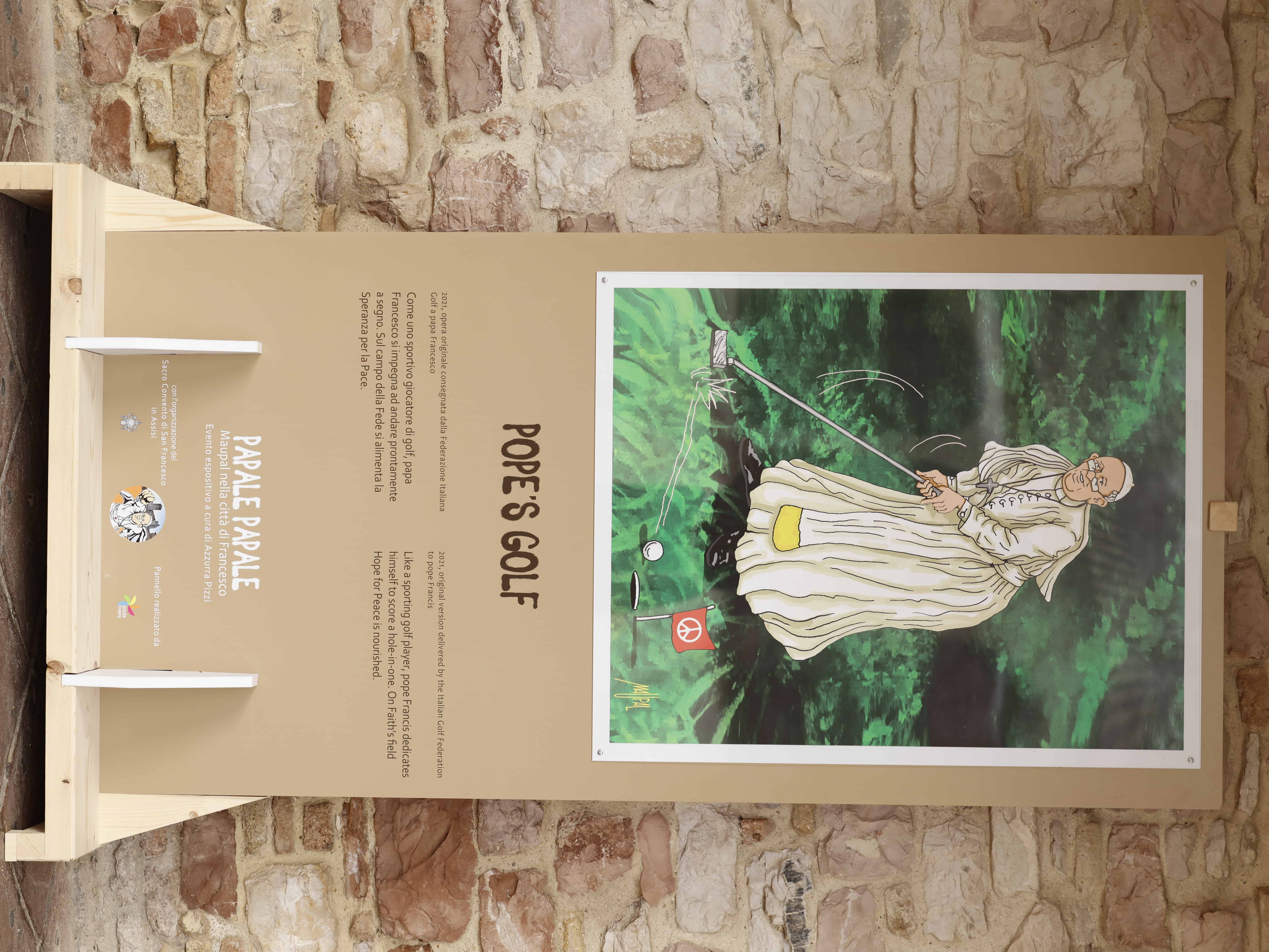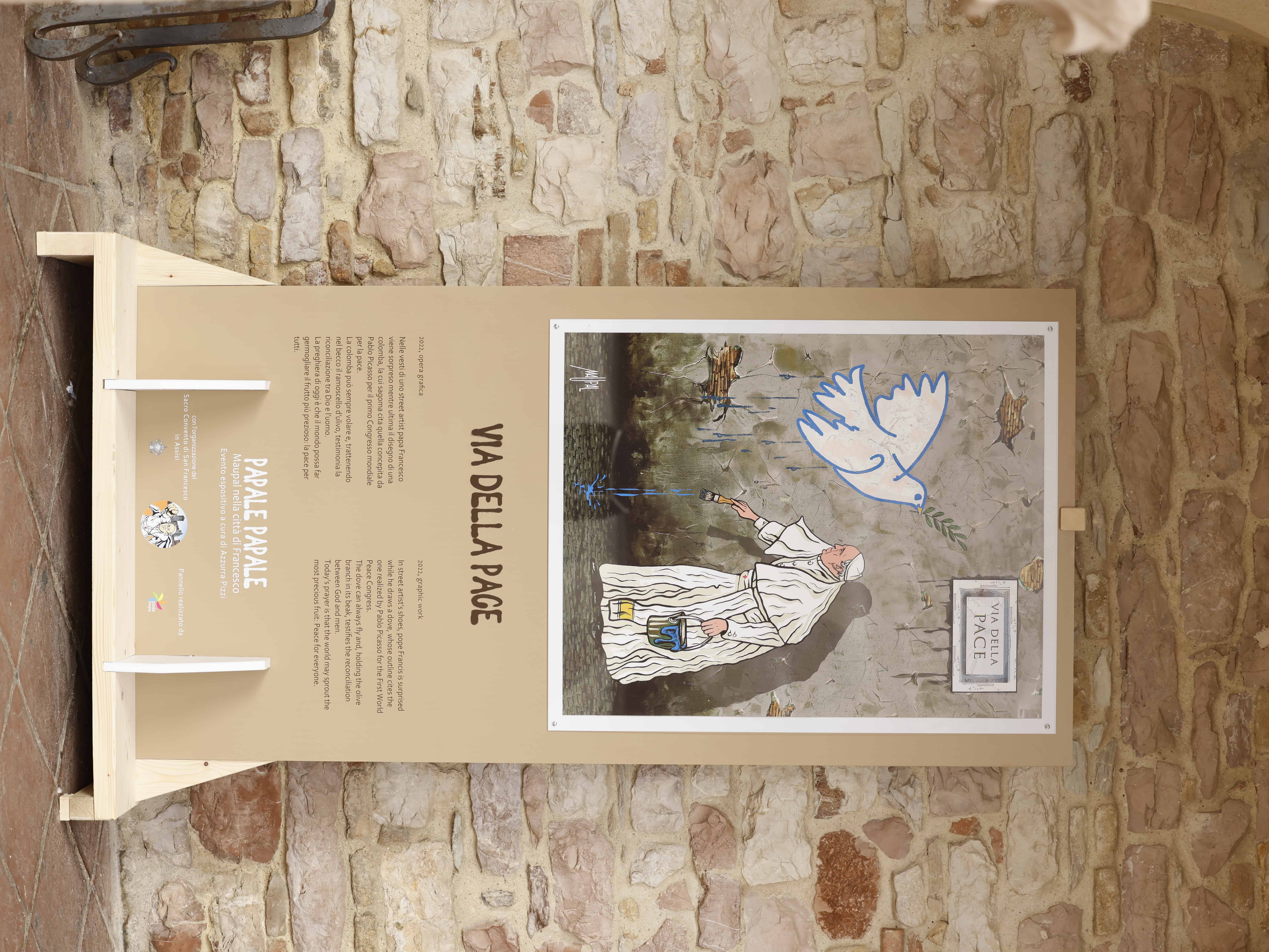 Tra le opere in esposizione: Super Pope (papa Francesco supereroe), Street Pope (il Papa che gioca a tris e vince con il simbolo della pace), Pope Saviour (il Papa porta su di sé il pianeta terra), Pope and Love, Papale Papale, Exemplum Omnibus, Eco Pope, Pope's Golf e Via della Pace. Per l’occasione è stata donata ai frati della Basilica di San Francesco un’opera inedita ispirata al Santo di Assisi dal titolo MURUM che è esposta nel Museo Tesoro della Basilica.