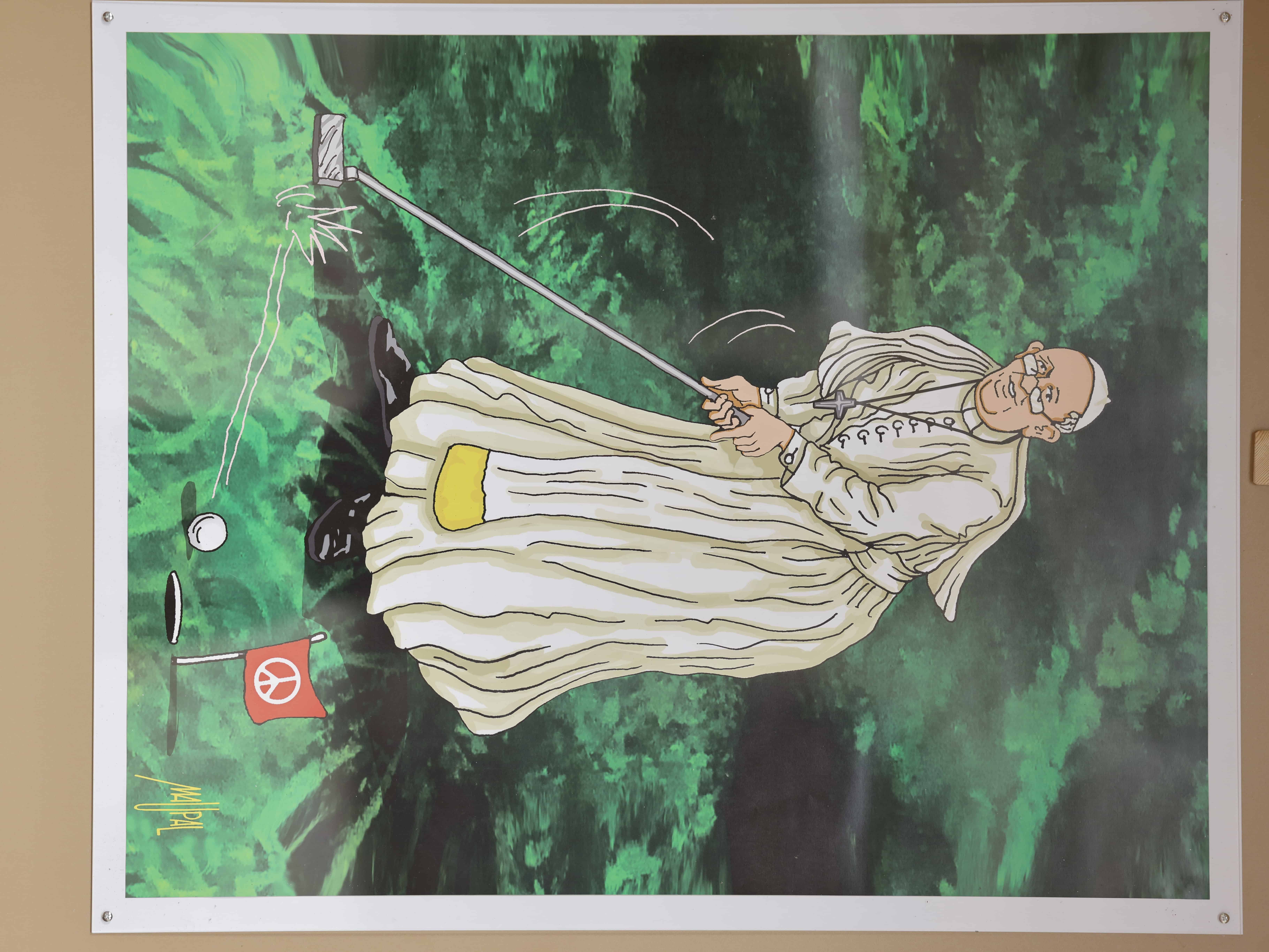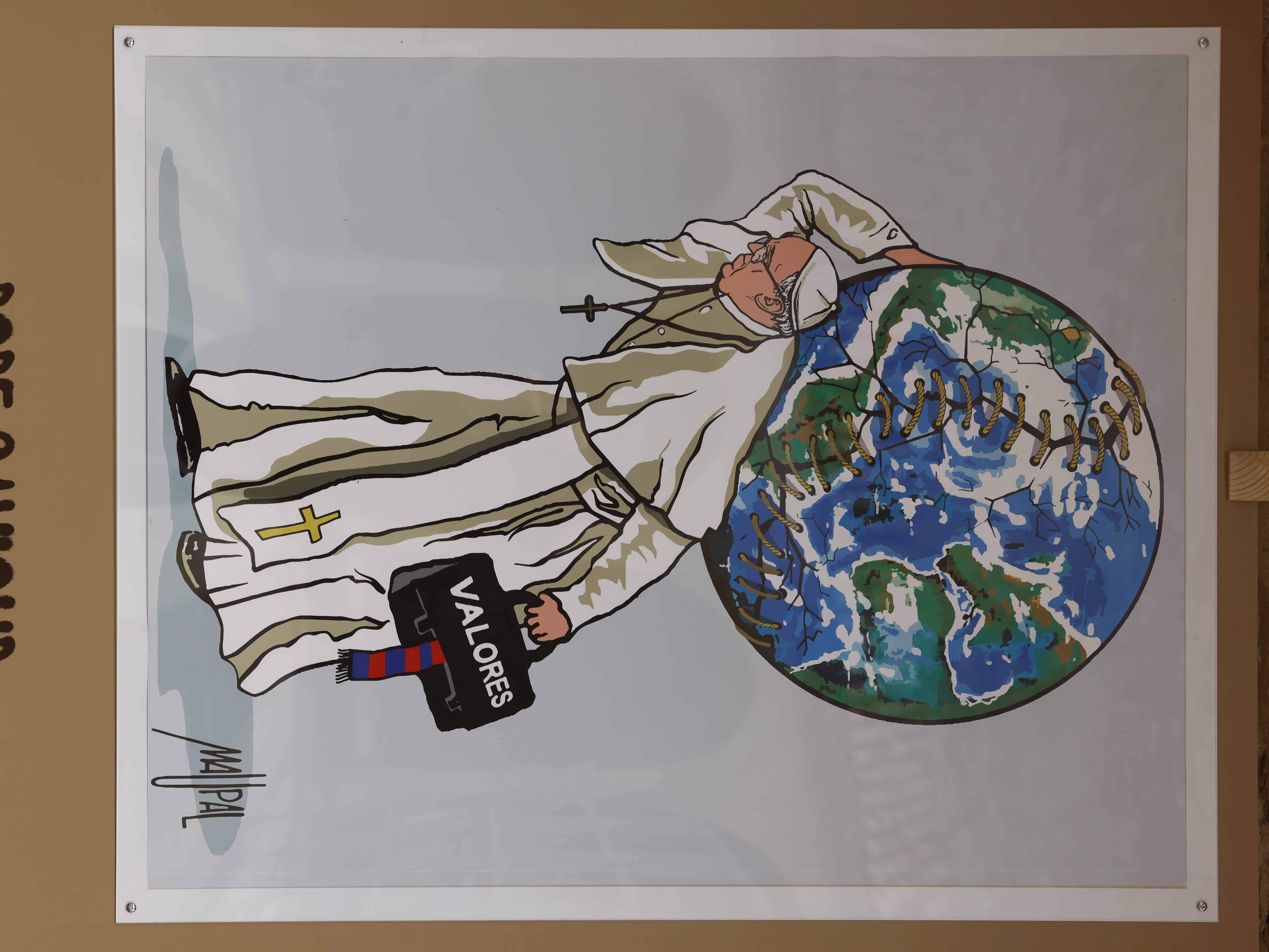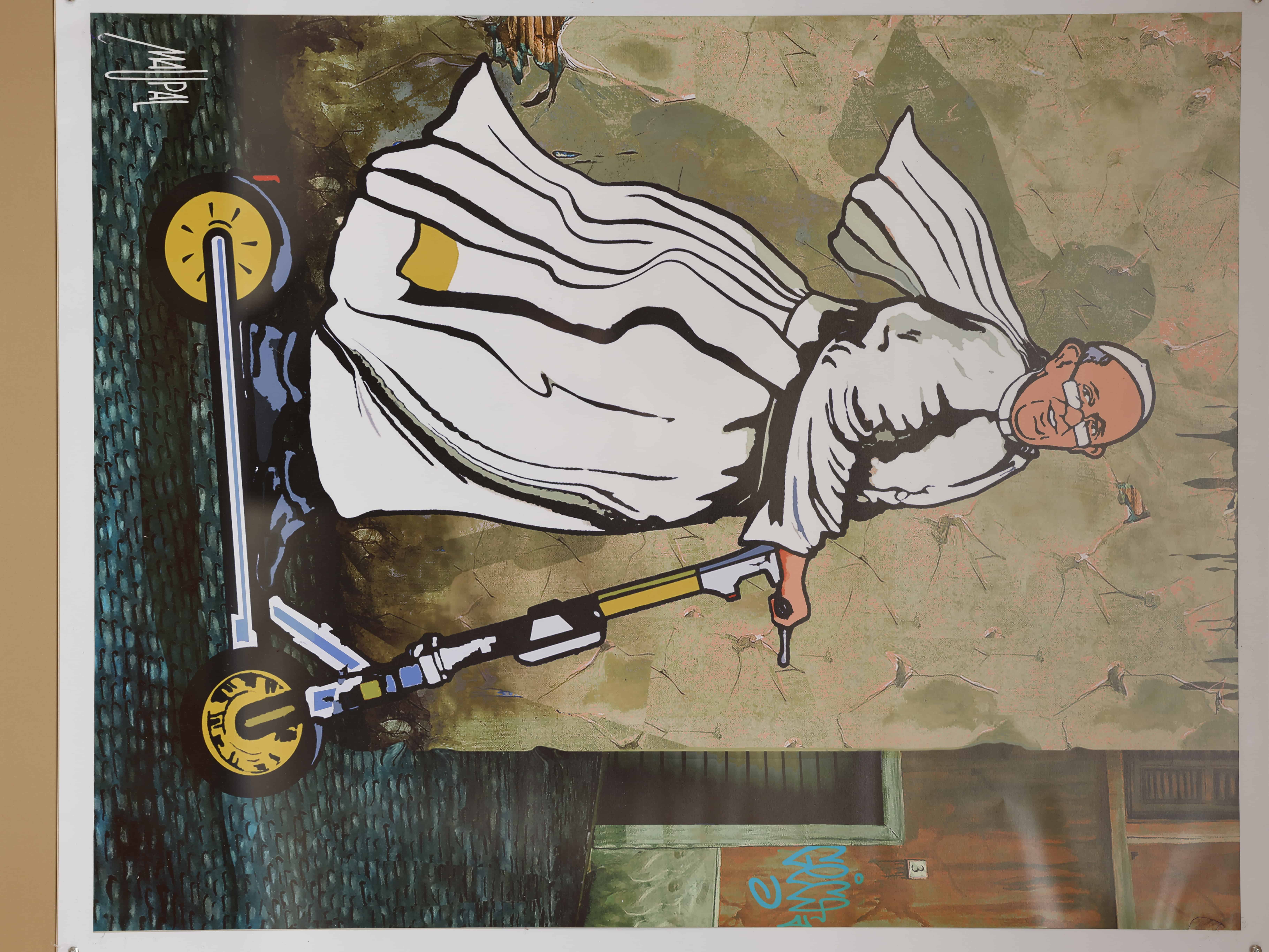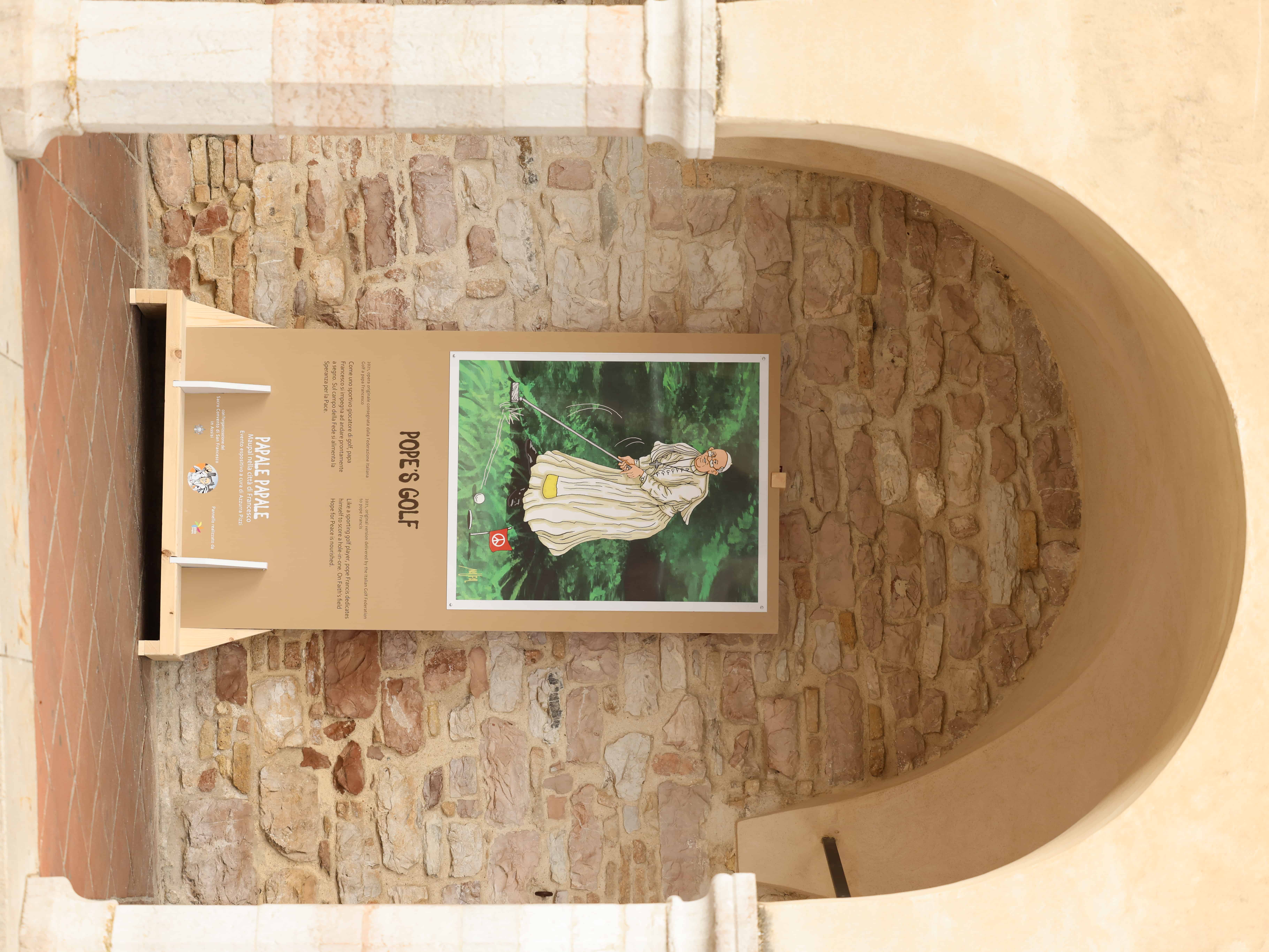 Tra le opere in esposizione: Super Pope (papa Francesco supereroe), Street Pope (il Papa che gioca a tris e vince con il simbolo della pace), Pope Saviour (il Papa porta su di sé il pianeta terra), Pope and Love, Papale Papale, Exemplum Omnibus, Eco Pope, Pope's Golf e Via della Pace. Per l’occasione è stata donata ai frati della Basilica di San Francesco un’opera inedita ispirata al Santo di Assisi dal titolo MURUM che è esposta nel Museo Tesoro della Basilica.