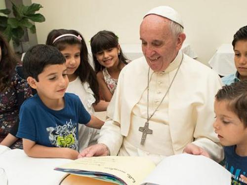 Scambio di doni con i bambini - Festoso lo scambio dei regali: al Papa è stato consegnato un album che raccoglie i disegni fatti dai bambini, raffigurazioni che raccontano "la bellezza di avere una casa" senza dimenticare "gli orrori della guerra". "Sono in salvo" è una frase che ha profondamente commosso il Pontefice, con le immagini della Siria distrutta dalla violenza.