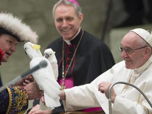 Un palloncino verde e rosso a forma di fiore, come quelli che si modellano a fiato nelle feste dei bambini, è stato donato al Papa durante l'udienza generale, da un clown del Golden Circus di Liana Orfei. Papa Francesco ha assistito divertito a una breve esibizione degli artisti. Oltre che con il palloncino e con un pennuto bianco che gli hanno poggiato su una mano, papa Bergoglio si è divertito verificando che non ci fossero trucchi nel tavolino che un prestigiatore faceva levitare davanti a lui. Si sono esibiti davanti al Papa, tra gli altri, due giocolieri, quattro acrobati-contorsionisti, due equilibristi, due ginnasti. Nei saluti pubblici, il Pontefice li ha ringraziati per "la gradita esibizione" e ha commentato: "la bellezza avvicina a Dio".