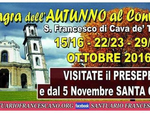 Ritorna nel fine settimana la sagra d’autunno al Convento Francescano di Cava de' Tirreni. La sagra è giunta alla diciannovesima edizione e sarà proposta non solo sabato 22 e domenica 23 ottobre ma anche il 29 e 30 ottobre. Sarà possibile degustare specialità autunnali, risotto ai funghi, penne alla boscaiola, castagne e vino. Durante la sagra, sono in programma anche visite al santuario con annesso museo e al presepe secolare. (www.salernotoday.it)