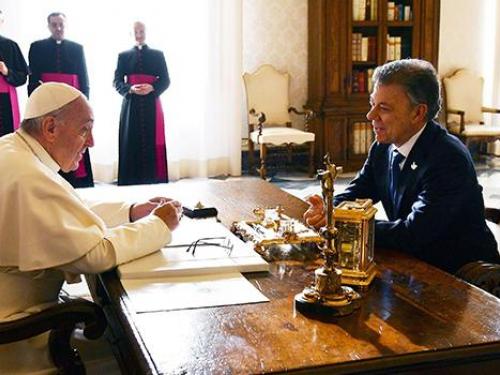 Il Papa si è fatto incontro al presidente Santos nella Sala del Tronetto, lo ha accolto con un "benvenuto, è un piacere incontrarla, è la terza volta che ci vediamo". Nello scambio di battute alla scrivania papale, il presidente ha anche detto: "abbiamo bisogno del suo aiuto". Chiuse le porte della biblioteca papale c'è stato lo scambio dei doni. Il presidente ha offerto il "baligrafo" con cui sono stati firmati gli accordi di pace con le Farc. Ha inoltre donato una piccola scultura di porcellana, raffigurante delle orchidee bianche. "Questa - ha spiegato al Papa - è l'opera di una artista colombiana, le orchidee sono il fiore nazionale della Colombia, e sono simbolo della pace". Papa Francesco ha ricambiato con il medaglione che raffigura l'angelo della pace, e tre libretti rilegati in rosso, presentando anche "i miei scritti sulla ecologia", ha spiegato al presidente. Tra i tre volumetti c'era dunque con certezza la enciclica "verde" di papa Bergoglio, la "Laudato sii" e probabilmente le due esortazioni apostoliche "Evangelii gaudium" e "Amoris laetitia".