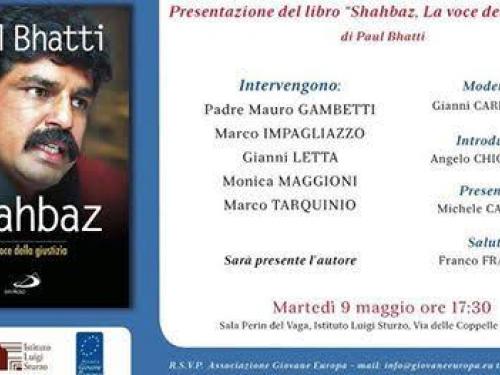 Shahbaz, la voce della giustizia . È il libro di Paul Bhatti sul fratello Shahbaz, il politico e ministro cattolico ucciso dagli estremisti islamici nel marzo del 2011, a Islamabad, per la sua azione in difesa delle minoranze religiose pakistane. Il libro verrà presentato oggi alle 17.30 all'Istituto Luigi Sturzo (via delle Coppelle 35, Roma). Oltre all'autore, interverranno (dopo i saluti di Franco Frattini e l'introduzione di Angelo Chiorazzo) il custode del Sacro Convento di Assisi padre Mauro Gambetti, il presidente della Comunità di Sant'Egidio Marco Impagliazzo, Gianni Letta, il presidente della Rai Monica Maggioni e il direttore di Avvenire Marco Tarquinio.