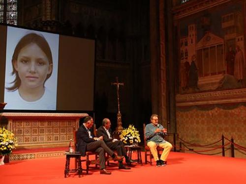 L'artista, ha poi parlato della sua ultima personale "Design for Humanity" - una raccolta di circa 70 mila volti di di tutto il mondo - che è in mostra nella piazza della Basilica inferiore di San Francesco fino al 26 settembre.