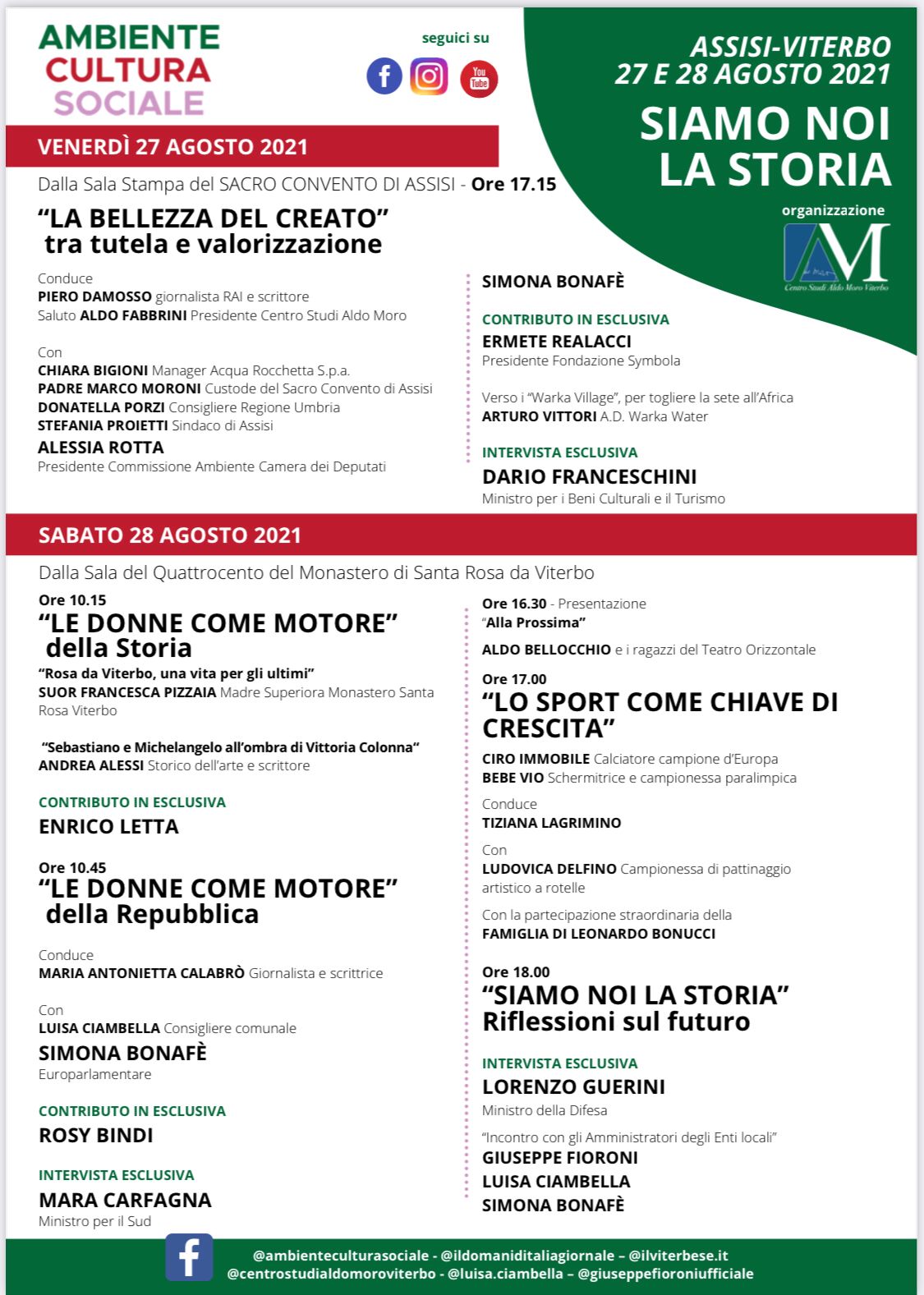 I temi: “La bellezza del creato” con il giornalista Rai Piero Damosso, il manager di Acqua Rocchetta Chiara Bigioni, fra Marco Moroni, la consigliera regionale Donatella Porzi, il sindaco di Assisi Stefania Proietti, l’europarlamentare Simona Bonafè, il presidente della Commissione ambiente della Camera Alessia Rotta, il presidente della Fondazione Symbola Ermete Realacci, l’ad di Warka Village Arturo Vittori ed il ministro della cultura Dario Franceschini; più il contributo del segretario del Pd Enrico Letta. Ci sarà poi una sessione dedicata alle donne, “Le donne come motore della Repubblica”, con la giornalista Maria Antonietta Calabró, la consigliera comunale Luisa Ciambella, il direttore di Operazioni Policarta Martina Giusti, l’onorevole Rosy Bindi ed il ministro per il Sud, Mara Carfagna.