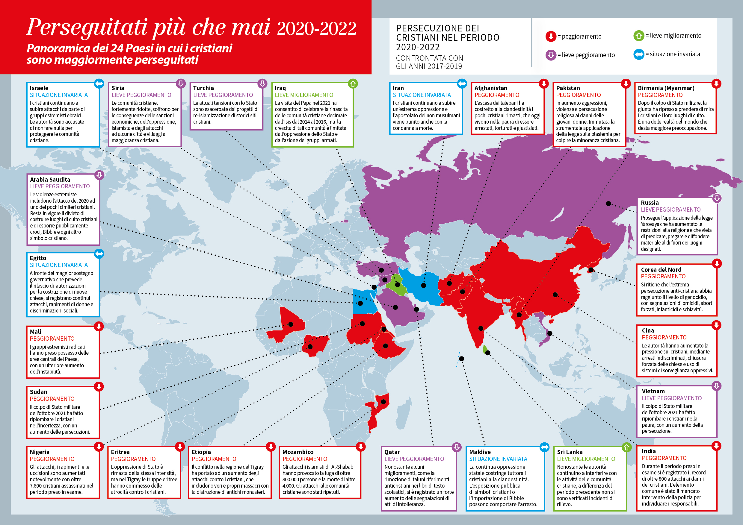 “Perseguitati più che mai. Rapporto sui cristiani oppressi per la loro fede 2020 – 2022”: è il titolo della ottava edizione del Rapporto della Fondazione pontificia Aiuto alla Chiesa che Soffre (Acs), diffusa oggi, e che offre un quadro della sofferenza dei cristiani oppressi per motivi di fede. Lo studio presenta “informazioni della stessa Acs e di fonti locali, testimonianze di prima mano, raccolte di eventi di persecuzione, studi di casi e analisi nazionali” da porre all’attenzione della pubblica opinione, dei mass media e dei responsabili istituzionali. Il report esamina 24 Paesi in cui le violazioni della libertà religiosa destano particolare preoccupazione: Afghanistan, Arabia Saudita, Cina, Corea del Nord, Egitto, Eritrea, Etiopia, India, Iran, Iraq, Israele e i Territori Palestinesi, Maldive, Mali, Mozambico, Myanmar, Nigeria, Pakistan, Qatar, Russia, Sri Lanka, Sudan, Siria, Turchia e Vietnam. Il periodo di riferimento va dall’ottobre 2020 al settembre 2022.