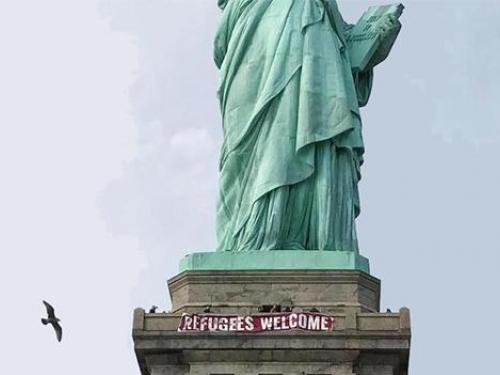 Un enorme striscione con su scritto 'I profughi sono benvenuti' è stato srotolato ai piedi della Statua della Libertà ed è rimasto sulla base per oltre un'ora prima che la polizia lo rimuovesse. Il fatto è avvenuto ieri sera, poche ore dopo l'annuncio del presidente Donald Trump di una stretta sull'immigrazione illegale. (Ansa)
