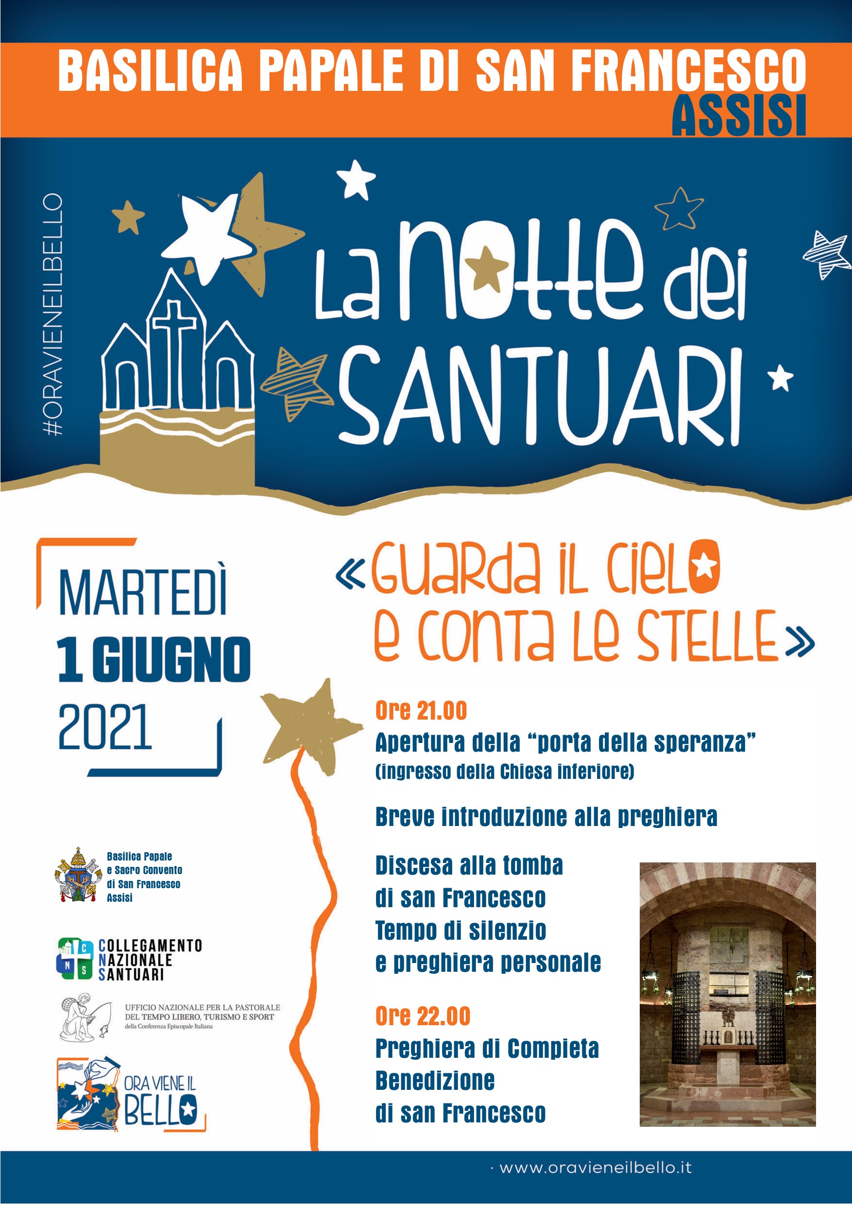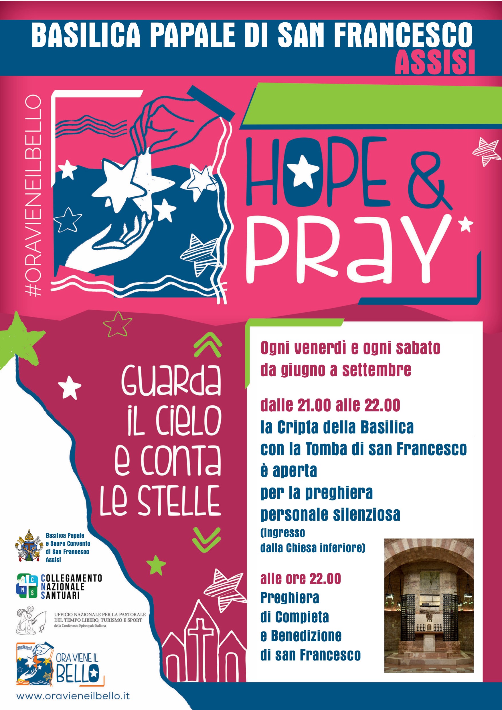 Il Sacro Convento di Assisi prenderà parte a una gamma di esperienze in cui darsi la possibilità di riprendersi il respiro della vita attraverso l’esperienza del Santuario, il tempo libero, il turismo, lo sport e l’ospitalità religiosa. Si tratta delle due iniziative "Notte dei santuari" (evento iniziale del 1 giugno) e di "Ora viene il bello" (con eventi ogni giovedì, dal 3 giungo al 16 settembre), proposte dall'Ufficio nazionale per la pastorale del turismo sport e tempo libero.