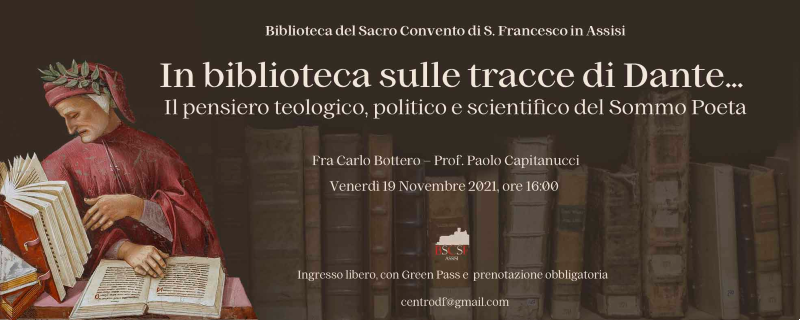 L’incontro è promosso dall’Accademia Properziana del Subasio nell’ambito del ciclo “I venerdì dell’Accademia”, ed inserito dal Comune di Assisi nell’elenco delle iniziative locali per il centenario dantesco. Si tratterà di un intervento “a quattro mani” tenuto da Fra Carlo Bottero, direttore della biblioteca, e dal prof. Paolo Capitanucci, dell’Istituto Teologico di Assisi, inteso soprattutto a valorizzare il patrimonio del Fondo antico della Biblioteca Comunale di Assisi, conservato presso la Biblioteca del Sacro Convento.
