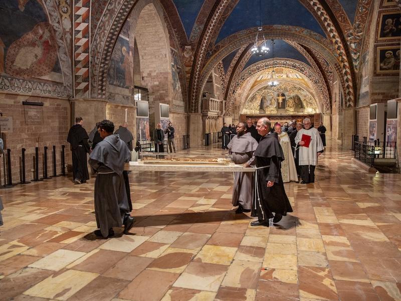 Celebrazione raccolta, commossa, intima e privata, ha segnato profondamente la comunità dei frati radunati attorno alle spoglie mortali del loro fondatore e padre. La celebrazione, breve e intensa, dopo l’ascolto del Vangelo della parabola del seme (Gv 12) - che è stata la chiave interpretativa teologico-spirituale di tutto l’evento dell’ostensione - e l’Ammonizione VI, è proseguita con la processione di tutti i frati presenti, la traslazione delle reliquie in cripta e si è conclusa con la benedizione solenne del presule.