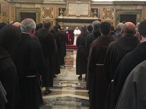 Questa mattina 400 frati delle famiglie francescane del Primo Ordine e del Terz’Ordine Regolare hanno incontrato, nella Sala Clementina del Palazzo Apostolico in Vaticano, Papa Francesco. Il Santo Padre a margine del suo intervento, ha spiegato che “quello che state facendo è un bel cammino di minorità. Siate minori con Dio, con i fratelli e con il creato”.