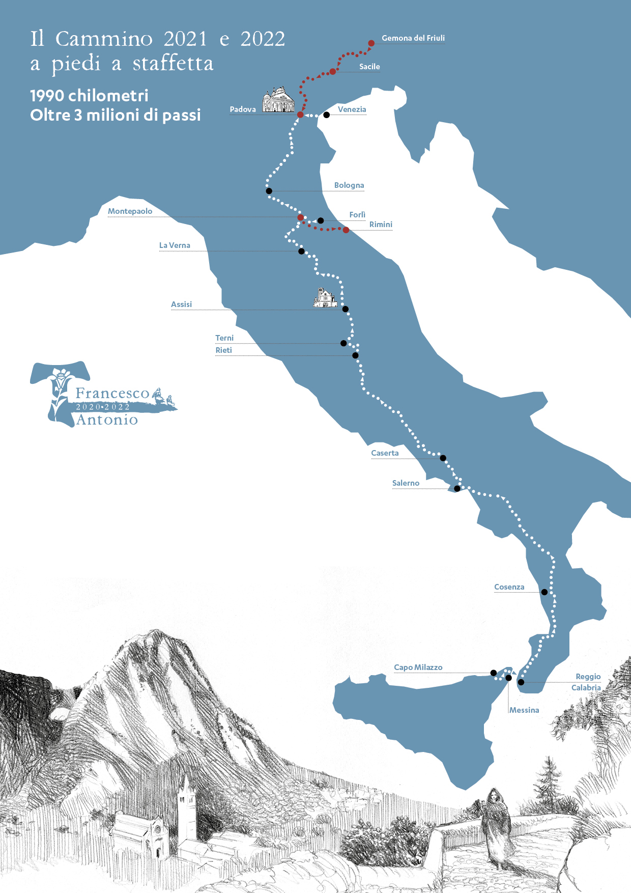 Sono oltre 1.800 chilometri, 3 milioni di passi, 92 tappe. Chiunque può coinvolgersi, camminando anche solo un chilometro insieme, o una tappa, o più tappe, senza iscrizione. Basta affiancare la staffetta e… sant’Antonio stesso, dal momento che in uno speciale zaino porta reliquiario, i pellegrini portano con loro una reliquia ex ossibus di sant’Antonio che viene affidata alla comunità cristiana sede di tappa fino alla ripartenza successiva. È il cuore di «Antonio 20-22», progetto sorto appositamente per valorizzare il triennio di ottocentenari antoniani.