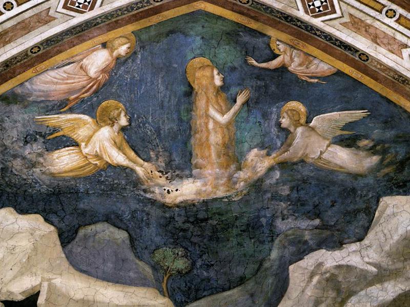 A distanza ravvicinata i capelli biondi di Maddalena che, inginocchiata, lava i piedi di Cristo rivelano trasparenze lievissime e la seguace di Gesù ha uno sguardo assorto che commuove: siamo nella scena della cena a casa del fariseo, in una delle sette magnifiche storie che Giotto e allievi dipinsero nella Cappella della Maddalena nella Basilica Inferiore di San Francesco ad Assisi.