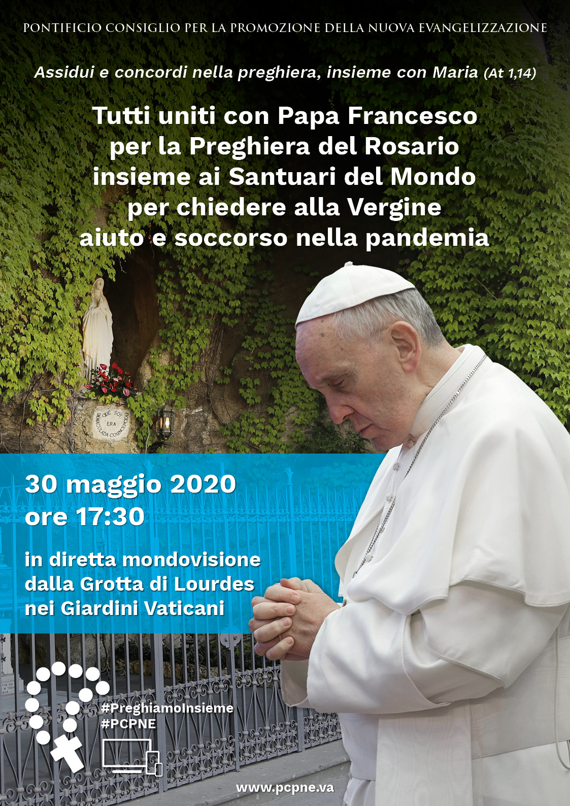Soprattutto in questo periodo di pandemia. Per chiedere l' aiuto e l' intercessione della Madre di Dio. Con una recita straordinaria del Rosario il Papa concluderà il mese mariano di maggio, dopo aver invitato fin dall' inizio tutta la Chiesa a pregare con la coroncina. La Sala Stampa della Santa Sede ha annunciato ieri che sabato 30 maggio alle 17,30 il Pontefice presiederà la preghiera mariana per eccellenza dalla Grotta di Lourdes nei Giardini Vaticani, unendosi ai santuari del mondo che a causa dell' emergenza sanitaria hanno dovuto interrompere le loro normali attività e i loro pellegrinaggi.