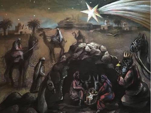 Il Maestro Ercole Pignatelli coglie, nell’opera donata ai Francescani del Sacro Convento di Assisi, questa forte valenza comunicativa. I personaggi della narrazione ci sono tutti: gli umili, i potenti e gli animali e sono tutti intorno a questa eccezionale famiglia. Tutta la scena rimanda a luoghi dove la terra si dissolve nel mare e il mare si mescola con il cielo: paesaggi natii che vengono dai ricordi del Maestro, paesaggi nei quali affiorano masserie come isole nelle pianure imbiondite dalle messi e dove il re mago, imponente e massiccio, può arrivare da una città favolosa ricca di cupole d’oro che riempiono il cielo di bagliori e di minareti che svettano come torri musicali. Il cielo, intenso e stellato, è squarciato dalla stella cometa … e improvvisamente questa stella rimanda ad altre stelle comete, ai bengala delle navi della Marina Militare che illuminano il nostro Mediterraneo dove tanti uomini, tante donne, tanti bambini in fuga dalla miseria, dalle persecuzioni e dalle guerre, si avventurano. Bagliori che squarciano il buio del mare e illuminano barconi che sono, talvolta, tragiche culle in balia delle onde. In quel momento, in quella intuizione si coglie tutta l’attualità del Presepe e sentiamo Francesco come un nostro contemporaneo che ci stimola a riflettere sulla vita e sulla morte a partire proprio dalla nascita di quel bambinello profugo di duemila anni fa.
