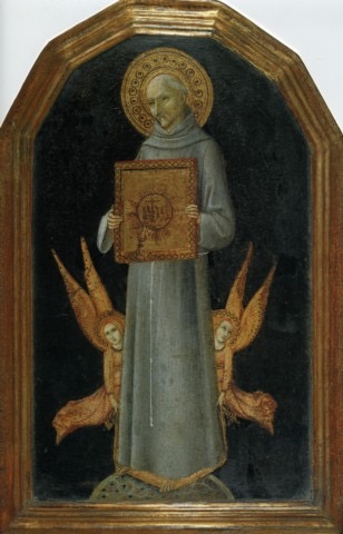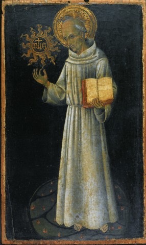 Bernardino da Siena, nato nel 1380 a Massa Marittima, fu un predicatore instancabile, in giro per tutta l’Italia settentrionale. Diffuse la devozione al nome di Gesù facendo incidere il monogramma «IHS»/«YHS» su tavolette di legno colorate in oro e azzurro, che dava da baciare ai fedeli al termine delle prediche. Il francescano andava su tutte le piazze di tutte le contrade e dei mille paesi che a passi frenetici visitò. I temi della sua predicazione erano quelli della pace, della concordia, in tempi in cui si faceva la guerra, e soprattutto di carità, perché ce n’era tanto bisogno per i poveri.