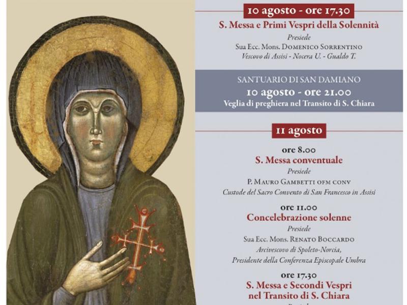 Anche quest’anno, seppur nel rispetto delle norme di sicurezza per il contenimento dell’emergenza Coronavirus, la comunità diocesana si prepara a festeggiare la solennità di Santa Chiara e quella del patrono San Rufino che cadono rispettivamente l’11 e il 12 agosto. Per quanto riguarda la solennità di Santa Chiara, dal 2 al 9 agosto alle ore 17,30 si terrà la novena con la santa messa e i vespri presieduti dai Frati minori della Fraternità di Loreto. Lunedì 10 agosto alle ore 17,30 i primi vespri e la santa messa della solennità saranno presieduti, nella Basilica dedicata alla Santa, dal vescovo della diocesi di Assisi – Nocera Umbra – Gualdo Tadino, monsignor Domenico Sorrentino.