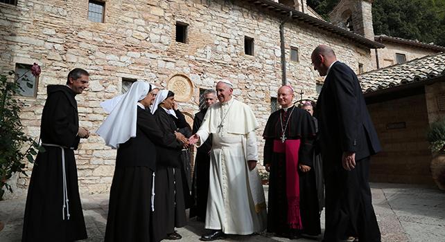 Antico romitorio, posto ad 800 metri di altezza, sulle pendici del monte Subasio. Immerso nel cuore della natura umbra, costellata una prosperosa boscaglia, si trova a circa cinque chilometri da Assisi. Il Santuario si è sviluppato attorno alla grotta di San Francesco, e alla Cappellina di Santa Maria. Questa cappellina viene fatta risalire al tempo del Poverello di Assisi che frequentò “i sassi di Maloloco”, così li chiamava per la scomodità, prima ancora di giungere a San Damiano. La parola “Carceri” deriva dal latino, “Carceres”, che significa luogo solitario, isolato. E proprio perché solitario, fu scelto dal Poverello di Assisi per ritirarsi in contemplazione, per riservare a sé stesso alcuni periodi di più intensa preghiera insieme ai primi seguaci. La Natura, la vegetazione così prosperosa, aiutavano il santo per il suo mistico dialogo con Dio. Di episodi – la cui veridicità non è provata – sul rapporto di Francesco e questo luogo sono tanti. Ne ricorderemo uno solo, per dare al lettore l’idea di quanto territorio e vita del santo potessero far nascere leggende, storie che rimarranno poi nell’ “immaginario collettivo francescano”. Tradizione vuole che il burrone nei pressi del monastero, sia in realtà il letto di un fiume, oggi in secca, le cui acque furono prosciugate da san Francesco poiché disturbavano la sua meditazione e quella dei suoi discepoli.