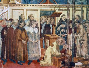 E come è possibile tutto questo? Ci viene in aiuto Giotto che qui in questa basilica, casa di Francesco, colui che chiamava il Natale la festa delle feste – ha dipinto la nascita di Gesù. Gesù è deposto nella mangiatoia e accanto alla mangiatoia ci sono il bue e l’asino. Secondo gli antichi cristiani in questa scena c’è un dono spirituale per noi, che ci rivela questa mentalità del Signore, questo suo modo di fare così paradossale. Il bue e l’asino rappresentano i popoli del mondo: il bue gli ebrei (che avevano il giogo – come i buoi – della legge di Dio, quella che Mosè aveva ricevuto sul monte) e l’asino tutti gli altri popoli, pagani, tutti coloro che non conoscevano il vero Dio: da questi popoli (romani, greci, etruschi…) discendiamo anche noi che siamo qui oggi. Ebbene sia il bue che l’asino (quindi tutti i popoli della terra) mangiano dalla stessa mangiatoia che non contiene che un po’ di biada (che non è proprio la cucina francese…!) e i due animali ci tornano regolarmente, perché hanno fame… Per gli antichi questa mangiatoia con la biada (un po’ di erba, grano e orzo) è simbolo dei nostri vizi, del male a cui ciascuno di noi si è abituato e che ricompie “regolarmente”. Pensiamo al dire le bugie: dico una bugia oggi, domani e dopodomani… e piano piano diventa un’abitudine; alzo la voce in famiglia oggi, domani e dopodomani e diventa piano piano un’abitudine; parlo male di un parente, di un vicino, di un collega oggi, domani e dopodomani e diventa un’abitudine.