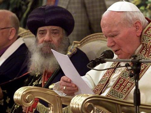 San Giovanni Paolo II in quel viaggio giubilare, ebbe parole d'affetto sia per la comunità cattolica copta definita "segno di unità della Chiesa", sia per quella ortodossa copta, che per oltre 15 secoli – a partire dal V secolo – si era staccata dalla Chiesa di Roma per le discordie esplose in seguito risoluzioni prese dal Concilio di Calcedonia in materia di natura divina e umana di Gesù Cristo. Una rottura che Paolo VI sanò restituendo nel 1968 le reliquie di San Marco ai cristiani egiziani e ricevendo il 10 maggio 1973 in Vaticano l'allora papa Copto Shenouda III. Lo stesso Shenouda al quale nel febbraio del 2000 Giovanni Paolo II rinnovò l'impegno a "evitare qualsiasi forma di proselitismo, o metodi e atteggiamenti che sono in antitesi con le esigenze dell'amore cristiano o con ciò che dovrebbe caratterizzare le relazioni tra le Chiese". "Non ci conosciamo a sufficienza - aggiungeva Papa Wojtyla - troviamo modi per incontrarci! Cerchiamo forme adatte di comunione spirituale, come la preghiera unita al digiuno, gli scambi e l'ospitalità reciproci fra monasteri. Troviamo forme di cooperazione pratica".