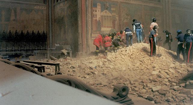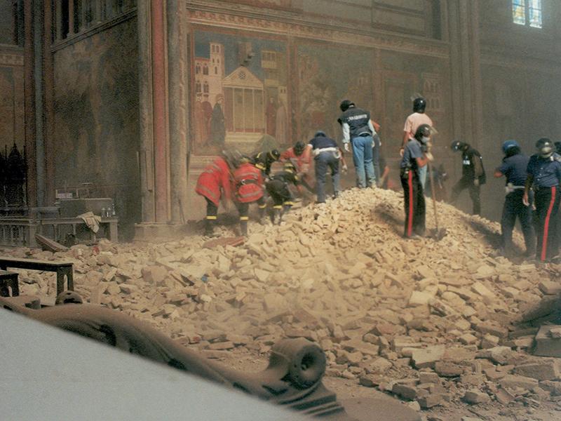 Il cielo delle volte della Basilica superiore era stato squarciato da due voragini di un centinaio di metri quadrati che si erano aperte sopra l’altare Papale e sopra l’ingresso della chiesa. Le pietre cadute avevano creato due cumuli alti qualche metro, sotto uno dei quali c'erano i corpi senza vita di un frate, un postulante e di due tecnici della sovrintendenza ai beni culturali dell'Umbria.