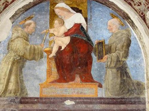 La chiesa un tempo ospitava numerose altre opere, in parte trasferite nella Pinacoteca Comunale ( la Madonna dei Consoli di Niccolò di Liberatore e l’Eterno tra i Santi Rocco e Romano di Pietro Perugino) e in parte disperse. Attiguo al fianco sinistro della chiesa è il chiostro che conserva due soli lati e scarsissime tracce delle antiche strutture trecentesche (pilastri di sostegno e conci in arenaria). Frammenti ormai illeggibili di affreschi del XVI sec., ancora visibili alla fine dell’ ottocento, si trovavano sopra la porta che immette nella sagrestia della chiesa. La chiesa francescana costituisce il principale luogo di culto di Deruta, con funzioni storicamente analoghe a quelle rivestite dalle cattedrali nelle città maggiori: è qui che i Derutesi si raccolgono per la celebrazione di tutte le principali ricorrenze religiose (dalla notte di Natale al venerdì Santo, così come chiaramente citato nello Statuto di Deruta Lib. I Cap. 33; Lib. III Cap. I), come d’altro canto sono le campane di san Francesco a scandire la giornata lavorativa e le principali ricorrenze liturgiche. Luca Nulli Sargenti Storico dell’Arte