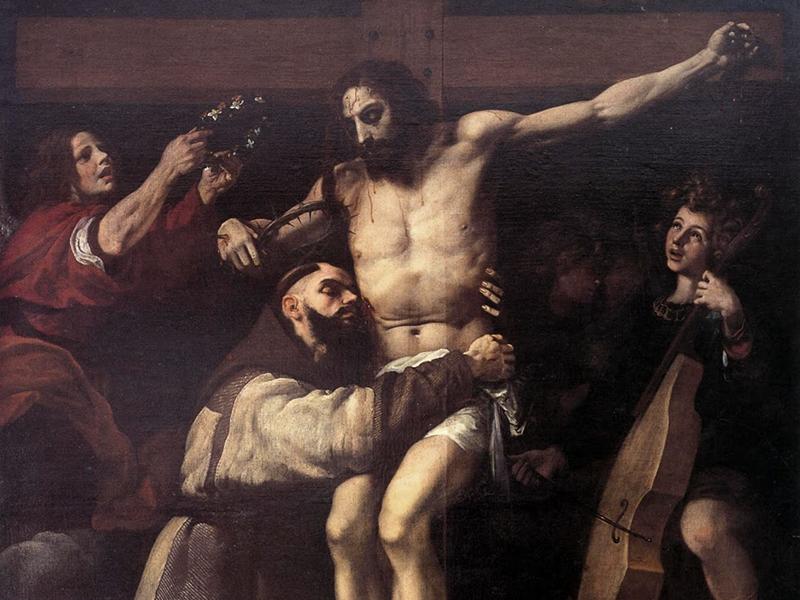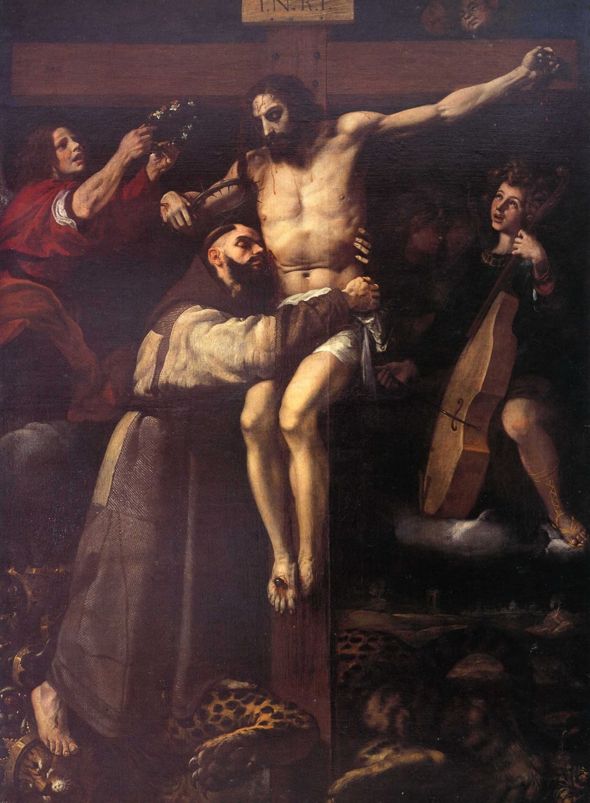 Di impronta caravaggesca è il quadro “San Francesco abbraccia Cristo crocifisso”, opera dello spagnolo Francisco Ribalta, realizzato intorno al 1620: è un olio su tela, di dimensione 208x167 centimetri, conservato presso il Museo de Bellas Artes di Valencia. L'opera, commissionata dal Convento dei Cappuccini della stessa città spagnola, mostra San Francesco che abbraccia Gesù; il santo d’Assisi avvicina la sua bocca al sangue che sgorga dalla ferita al suo costato; di fondo, ci sono due angeli - l’uno suona una viola; l’altro, depone su Cristo una corona di fiori - che sono testimoni “attivi” di questa sublime scena.