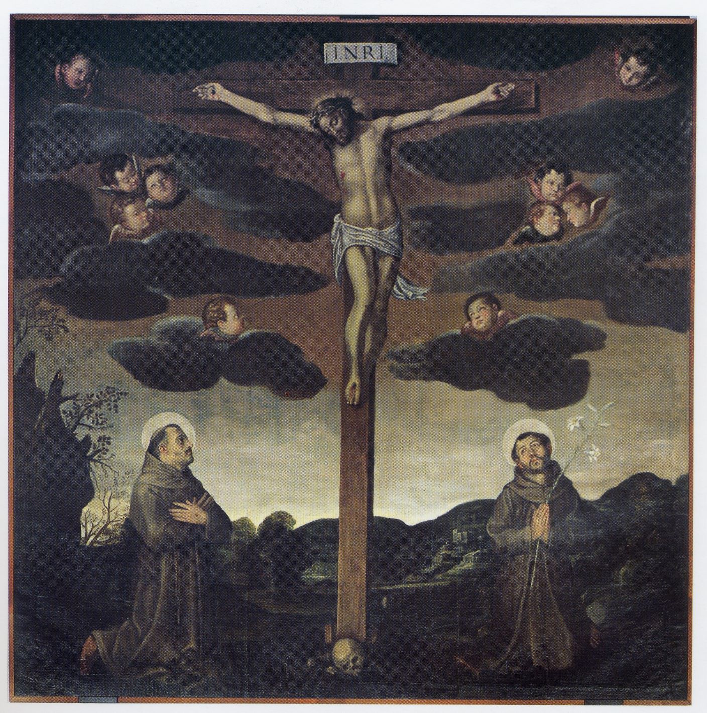 Una tela, poco conosciuta, ma più che descrittiva per soggetti rappresentati e stile di forme e colori, è quella che si trova nella chiesa di San Francesco d’Assisi, a Borgo Valsugana, comune montano in provincia di Trento: è il “Cristo crocifisso tra San Francesco d’Assisi e Sant’Antonio da Padova”, un olio su tela delle dimensioni di metri 2,70 x 2,65, del XVII secolo, attribuita all’artista Lorenzo Fiorentini. Il titolo dell’opera già dice molto: i due santi francescani sono ai piedi del Cristo crocifisso che incombe al centro dell’opera. I santi Francesco e Antonio sono inginocchiati sulla nuda terra, in adorazione di Cristo crocifisso che dall’artista Fiorentini viene svuotata di ricerca naturalistica.